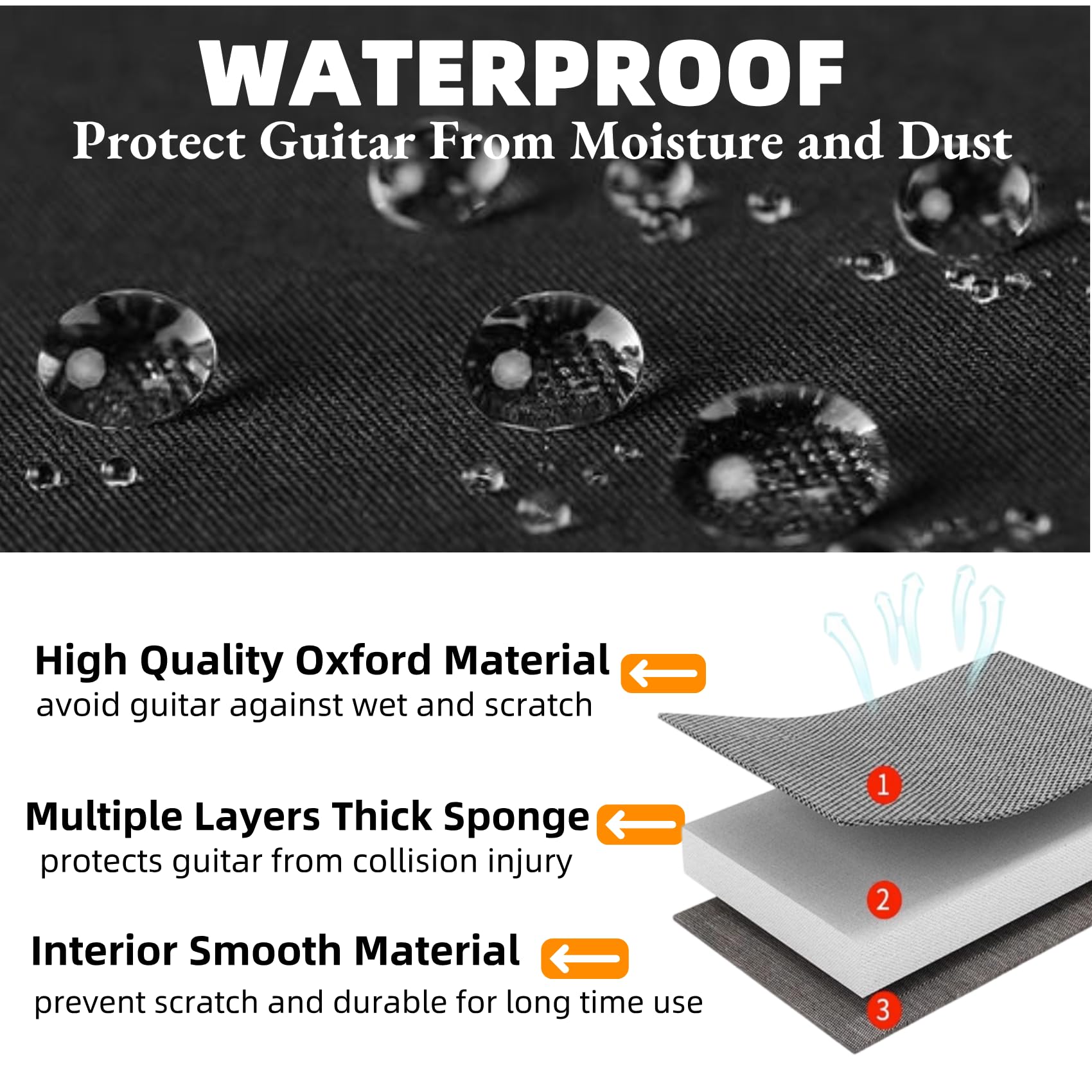 0.35in Padding Throughout+Special-made Stronger Metal Zippers: This black GIGKOUKI padded gig bag is for basic storage and carrying need, protects your guitar from collision injury when storing and transporting. High quality oxford cloth avoid your guitar against wet and scratch, also Larger durable two-way metal zippers and rubber shockproof base protect the guitar in all directions.