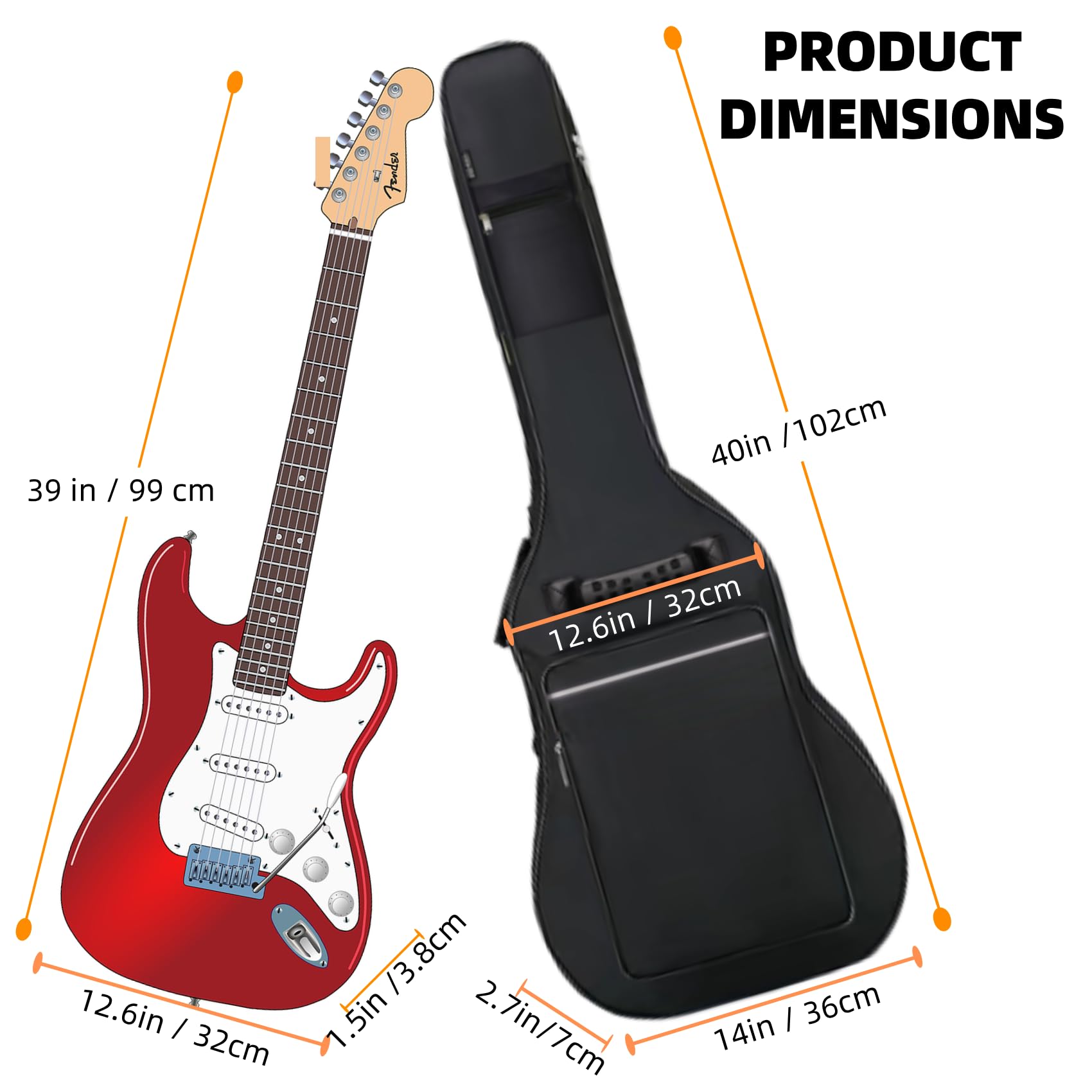 Lightweight Portable Guitar Bag for Electric Guitars: Dimension 40 x 14 x 2.7in, fits for 39 inch Electric Guitars. NOTE: THIS SOFT GUITAR CASE IS TOO SHORT FOR ELECTRIC BASS GUITARS. Please select electric bass bags from our store if you need.