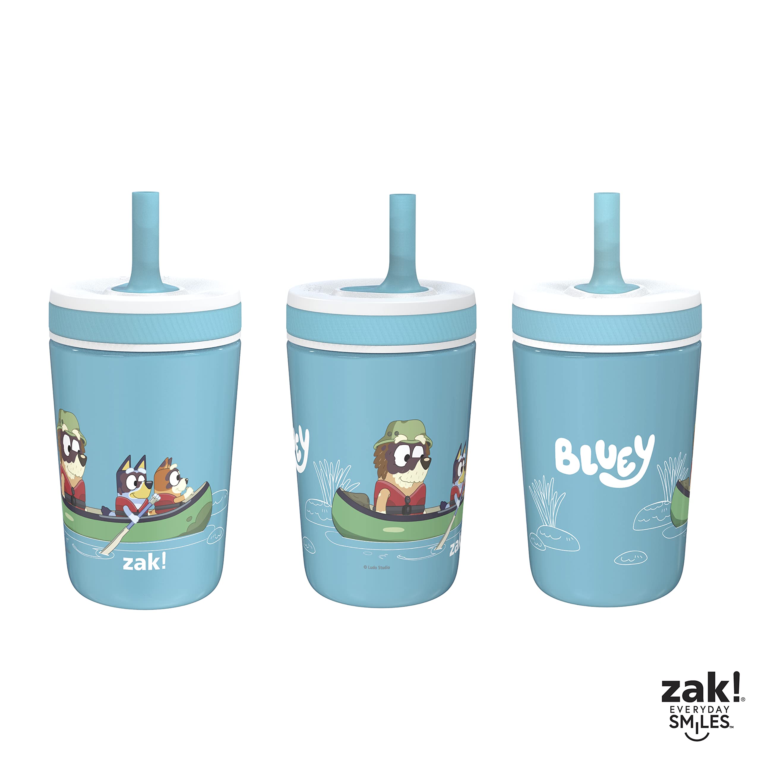 This leak-proof tumbler from Zak Designs makes hydration fun for any Bluey fan! Durable Materials: The tumbler is made from food-grade, 18/8 stainless steel, and the comfortable straw is made from silicone. Everything is completely BPA free, and the lid can be disassembled for easy cleaning. Leak-Proof Straw: The straw spout has a built-in valve that allows liquid to flow when drinking and prevents spills when the tumbler is tipped over. It's perfect for travel or for young children graduating from sippy cups. Vacuum Insulation: The stainless steel tumbler has vacuum insulation that keeps drinks cold for up to 10 hours, so your water is always refreshingly chilled. The double-wall construction also prevents condensation from forming on the outer walls, eliminating messy water rings.Hydrate Anywhere: The tumbler won't splash or leak and fits in car cup holders, making it ideal to take on the go. At home, you don't have to worry about spills or stains around fabrics or electronics, and drinks stay easily accessible through the straw. Specifications: 12 oz capacity. Vacuum insulated. Made of durable stainless steel and silicone. BPA-Free - Zak is committed to safety. Hand wash tumbler, top rack dishwasher safe, do not microwave. Length: 3.2-inch, Width: 3.2-inch, Height: 6.77-inch. Character: Bluey, Bingo, Grandad Mort (Bluey).