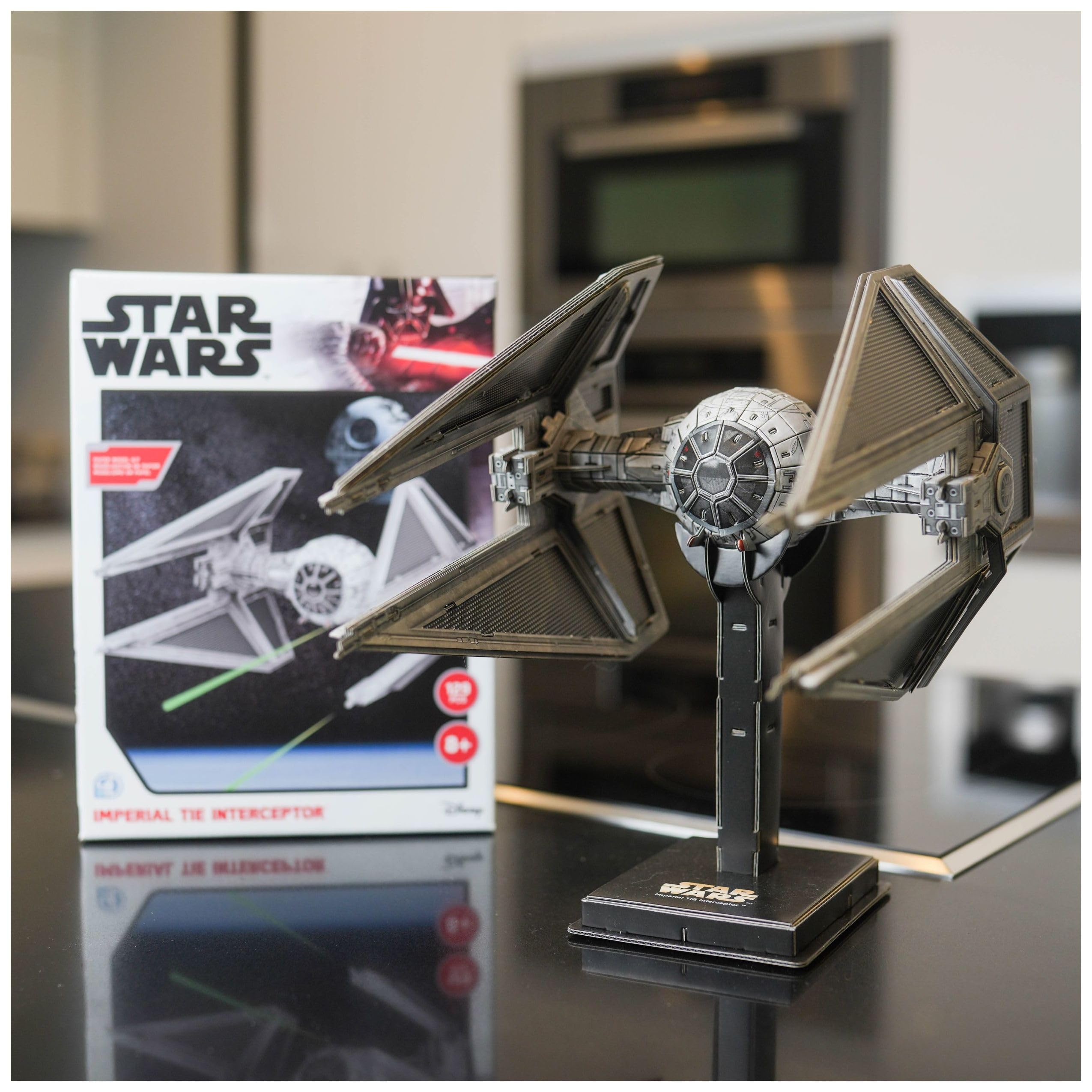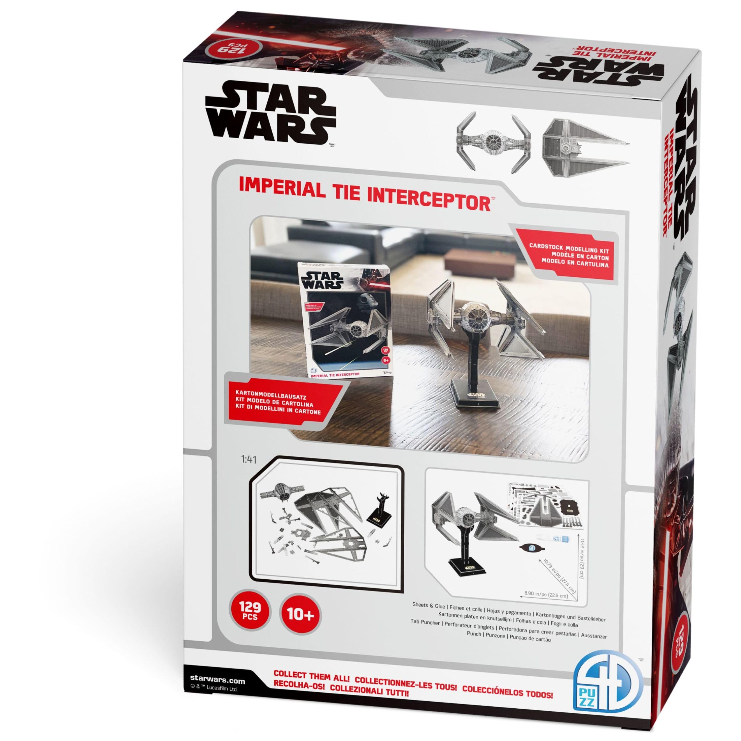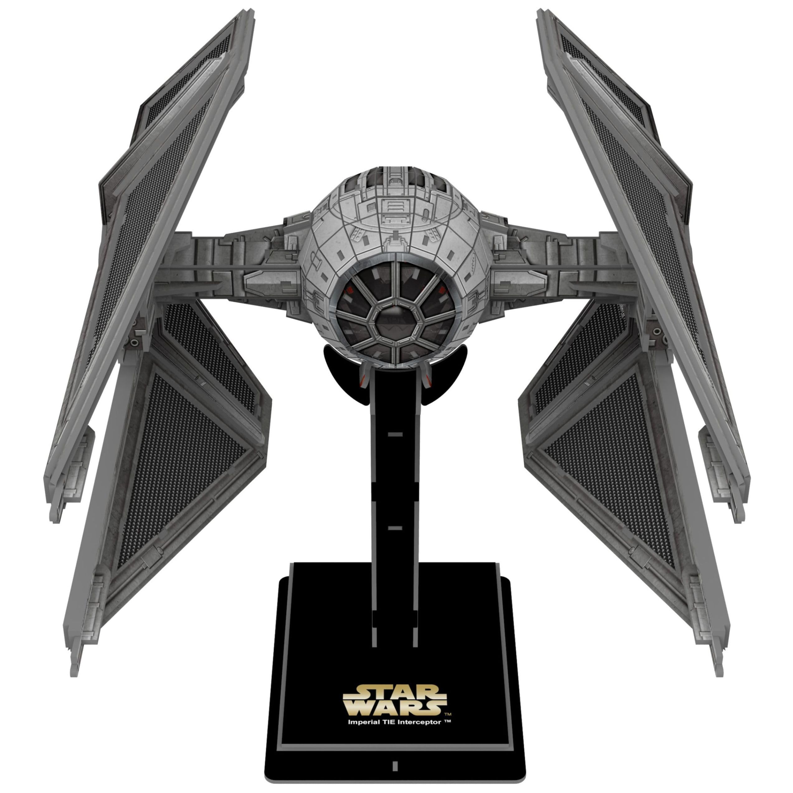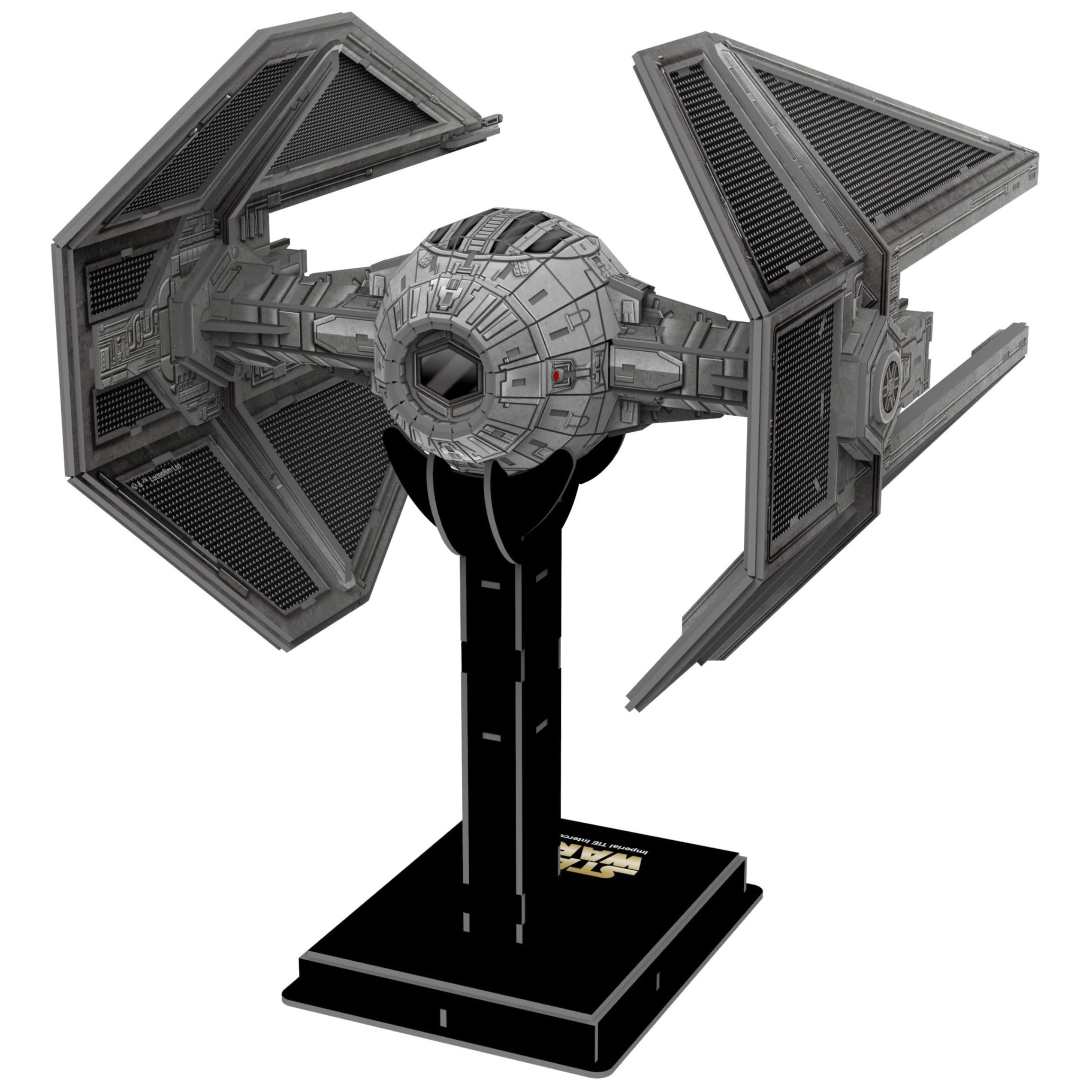 4D Precision Model Kits introduces to you the official 4D Star Wars Imperial TIE Interceptor™. Manufactured with our Precision Core-Gate™ Technology, each model is an Official Star Wars™ Licensed Product. 4D and Lucasfilm has officially partnered together to bring you the most detailed 4D kits we have manufactured to date. With our Precision Core-Gate™ Technology our modeling sheets are manufactured with 1.85 mm thickness. All color specs are approved through pantone references to match the true likeness and color. The final assembled product is a real-life collectible model for any fan. A full instruction booklet is included. A tube of 6 ml modeling glue is also provided as small amounts are required during the final steps of the assembly. Additional stands are included for final display purposes. Scale: 1:41 Size: 8.5" x 7.87" x 13.19" 129 pcs Assembly Time: 4 hours Material: Core-Gate™ Paper Technology