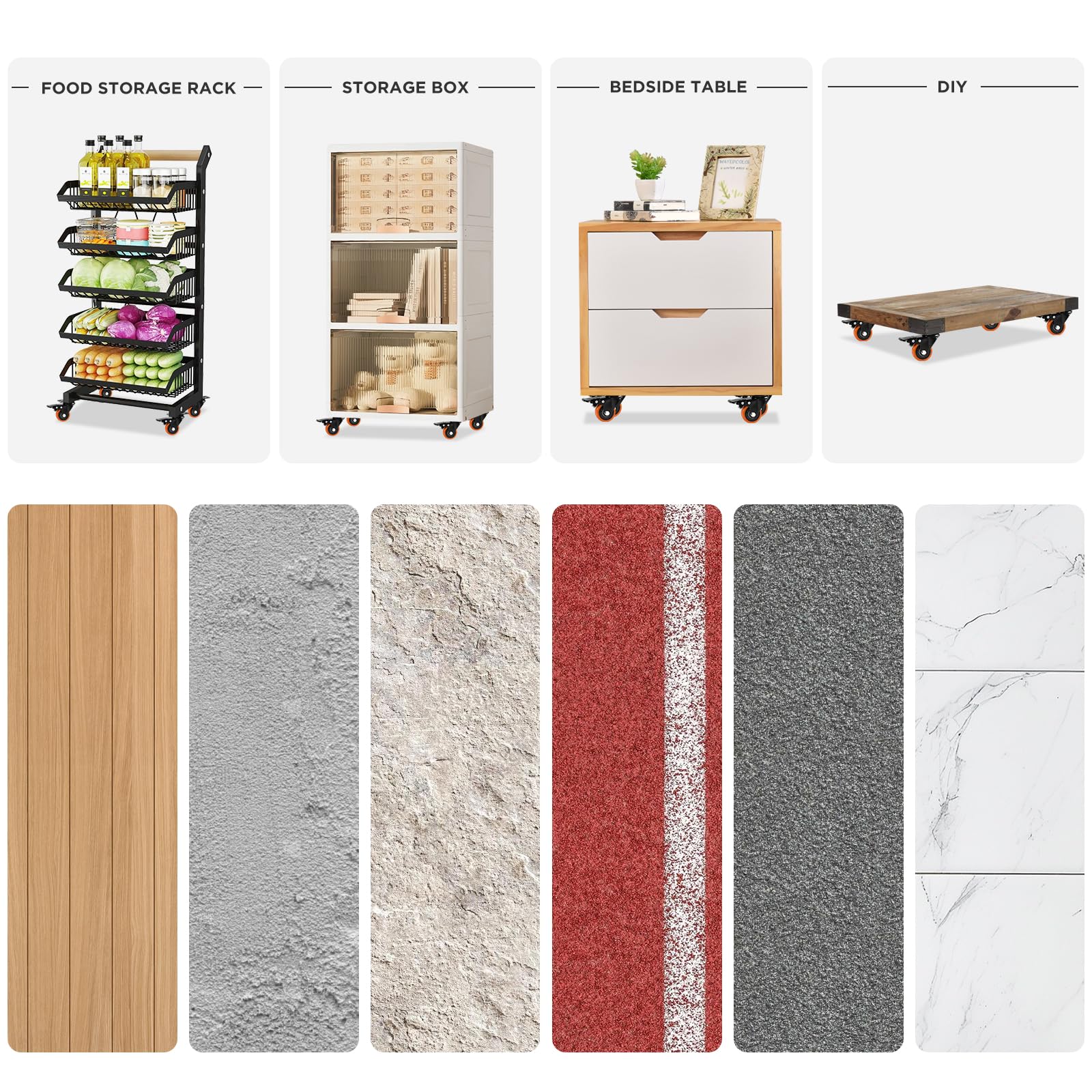 【Widely Use】The casters with brake are widely used for furniture, cart, workbench, plate, and for easy movement of heavy objects and equipment, enhancing work efficiency. They can also adapt to various ground conditions, such as smooth tiles, rough concrete, carpets, or grass.