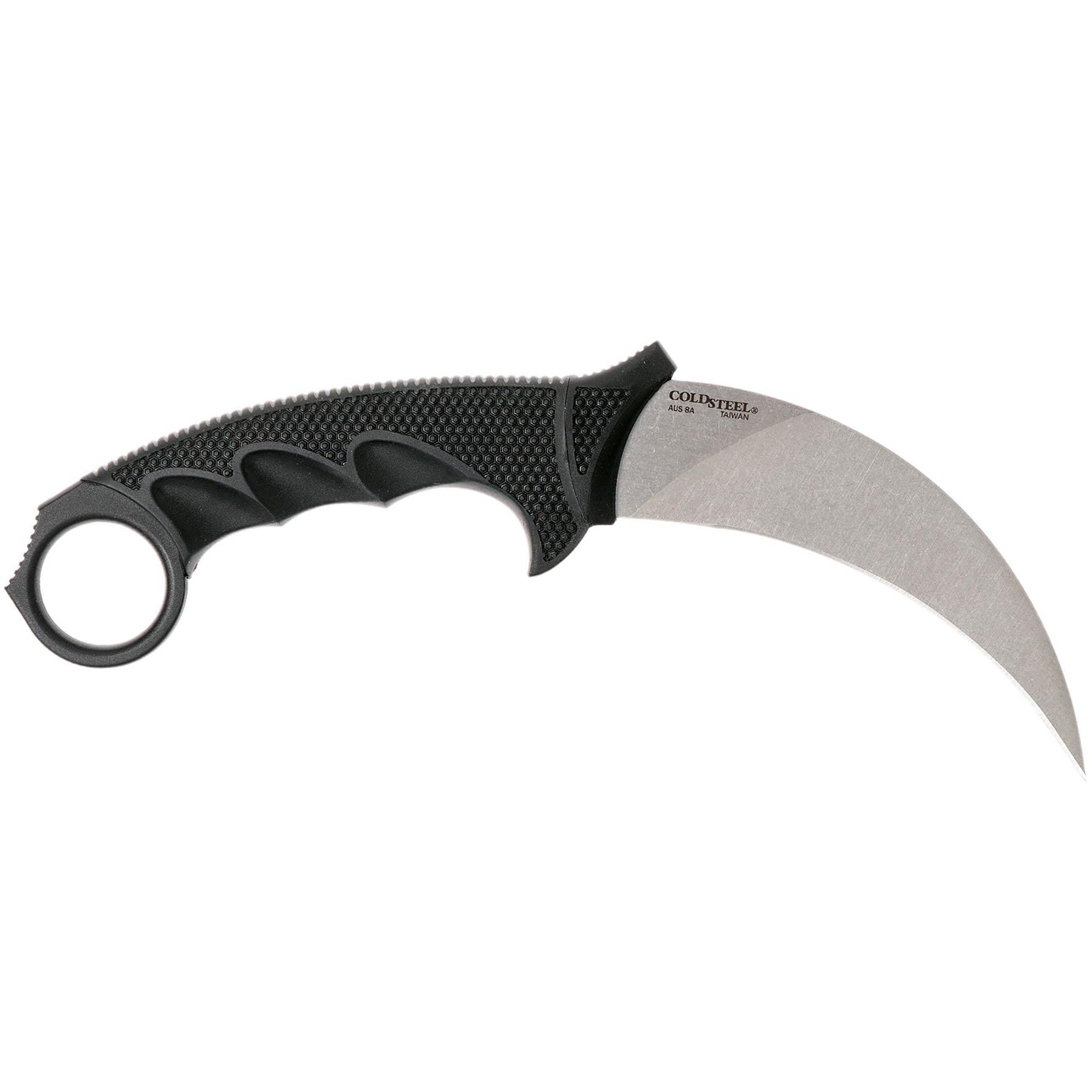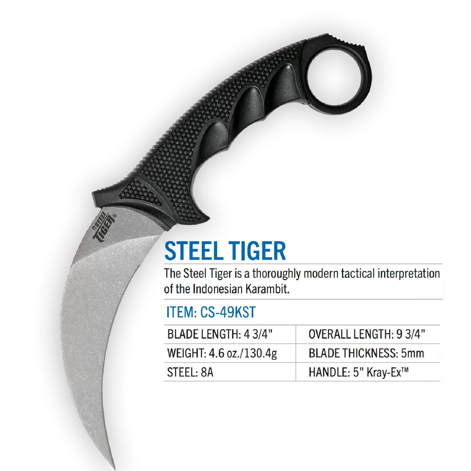 SPECS - Weight: 5oz; Blade Thickness: 5mm; Blade Length: 4-3/4"; Blade Steel: Japanese AUS8A Stainless w/ Stonewashed Finish; Handle Length/Material: 5" Griv-Ex w/ over-molded Kray-Ex; Overall Length: 8-3/4"; Knife Type: Fixed Blade; Blade Shape: Karambit