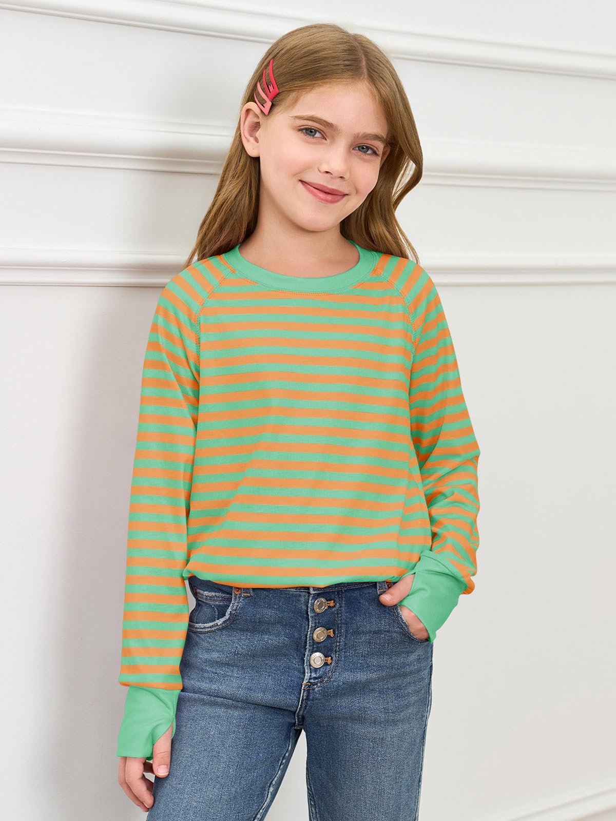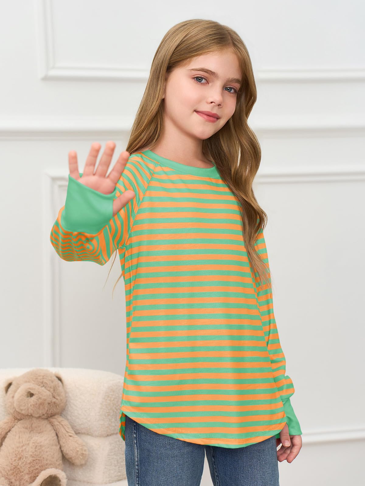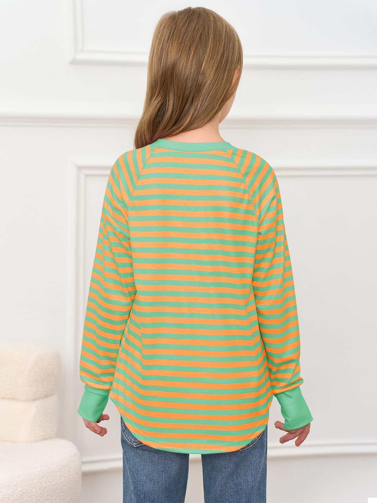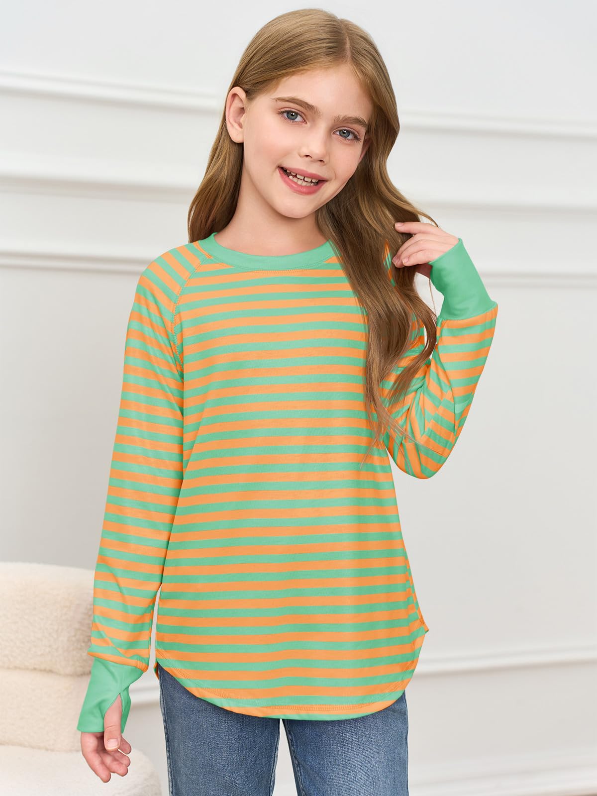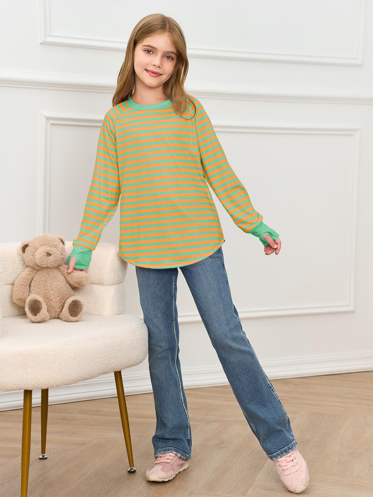 Features: Long sleeve shirts for girls loose fit, casual pullover tunic round neck tops with thumb holes, casual t-shirt, crew neck sweatshirt for kids, cute fall tops with curved hem, classic stripe colors top. The curved hem will bring some much needed “oomph” to your day-to-day looks