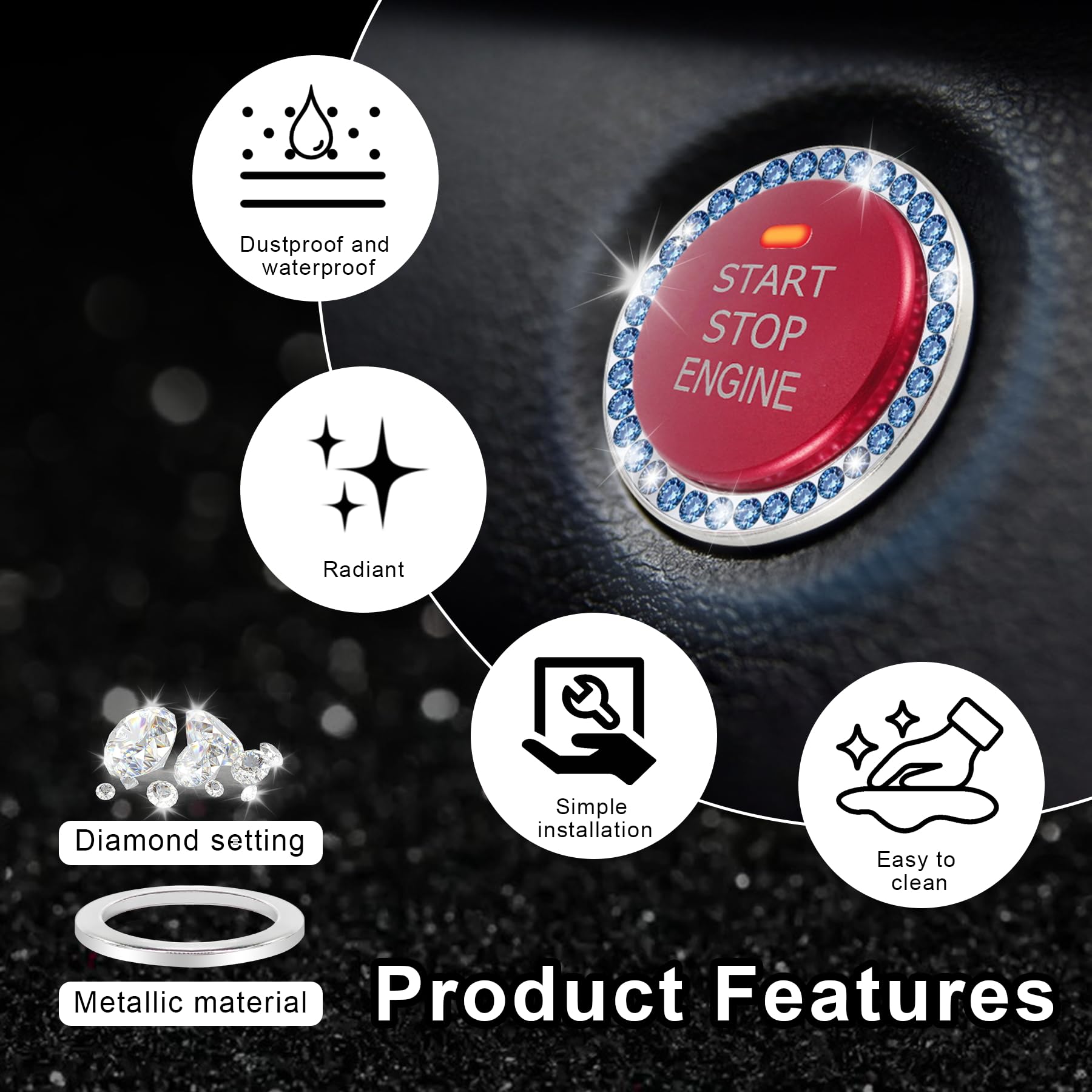 【High quality】Push to start button decoration ring made of high quality zinc alloy, which is sturdy and durable, and with Double ring crystals on it, making the product dazzling and beautiful for Car Glam Interior Accessories and Unique Women Gift.