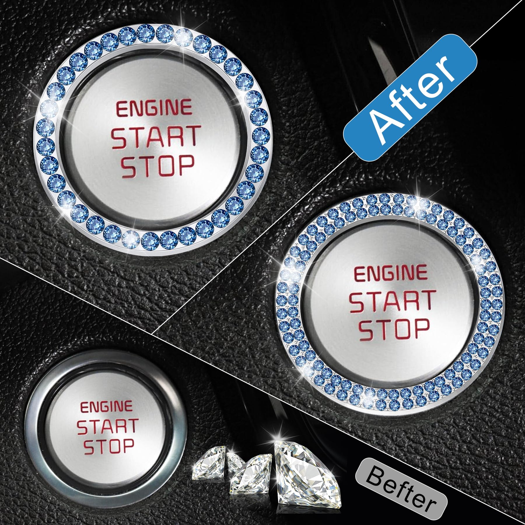 【Application】These rhinestone ring decors accessories can be used for car engine start/stop push buttons, car a/c knobs, radio switches, stick shift etc.