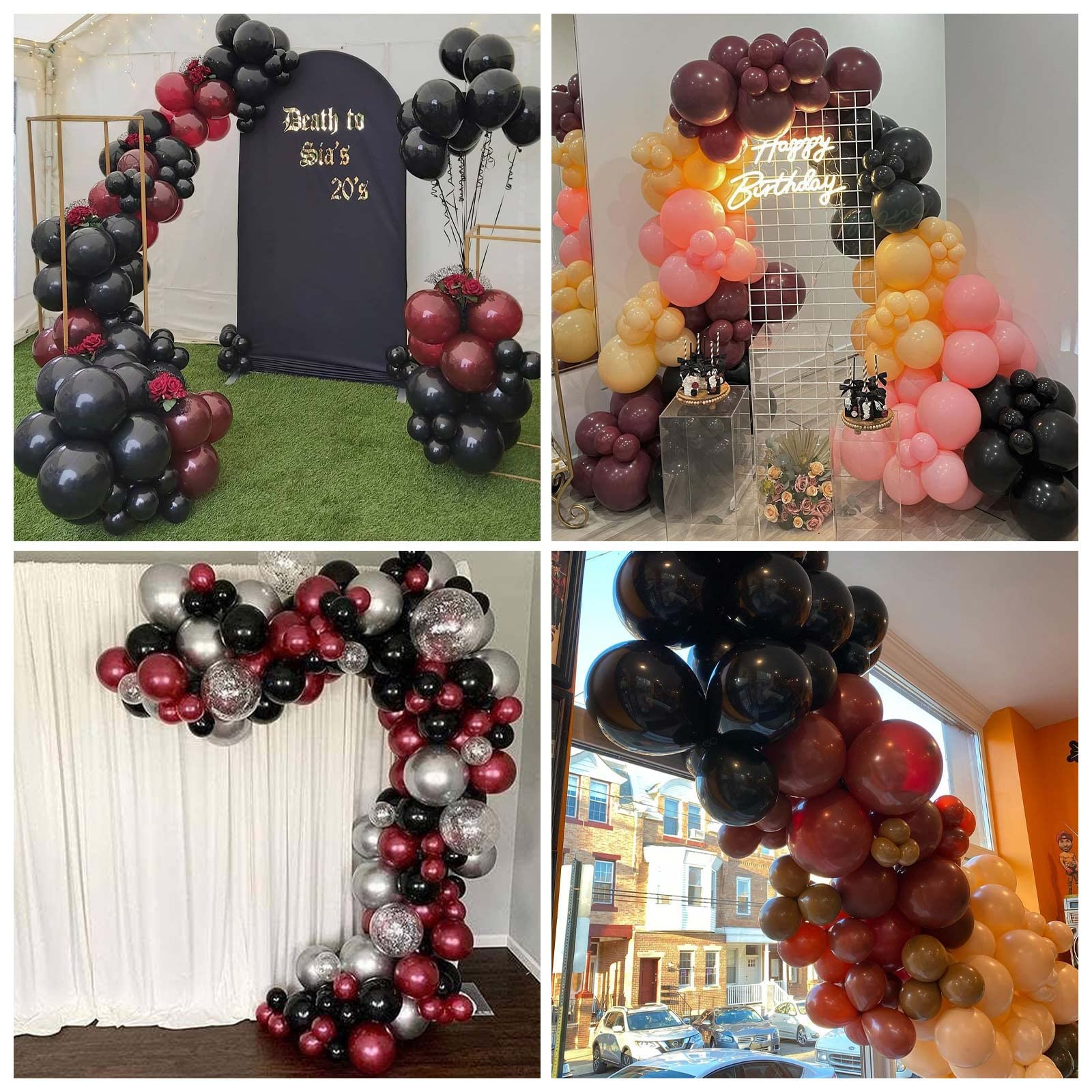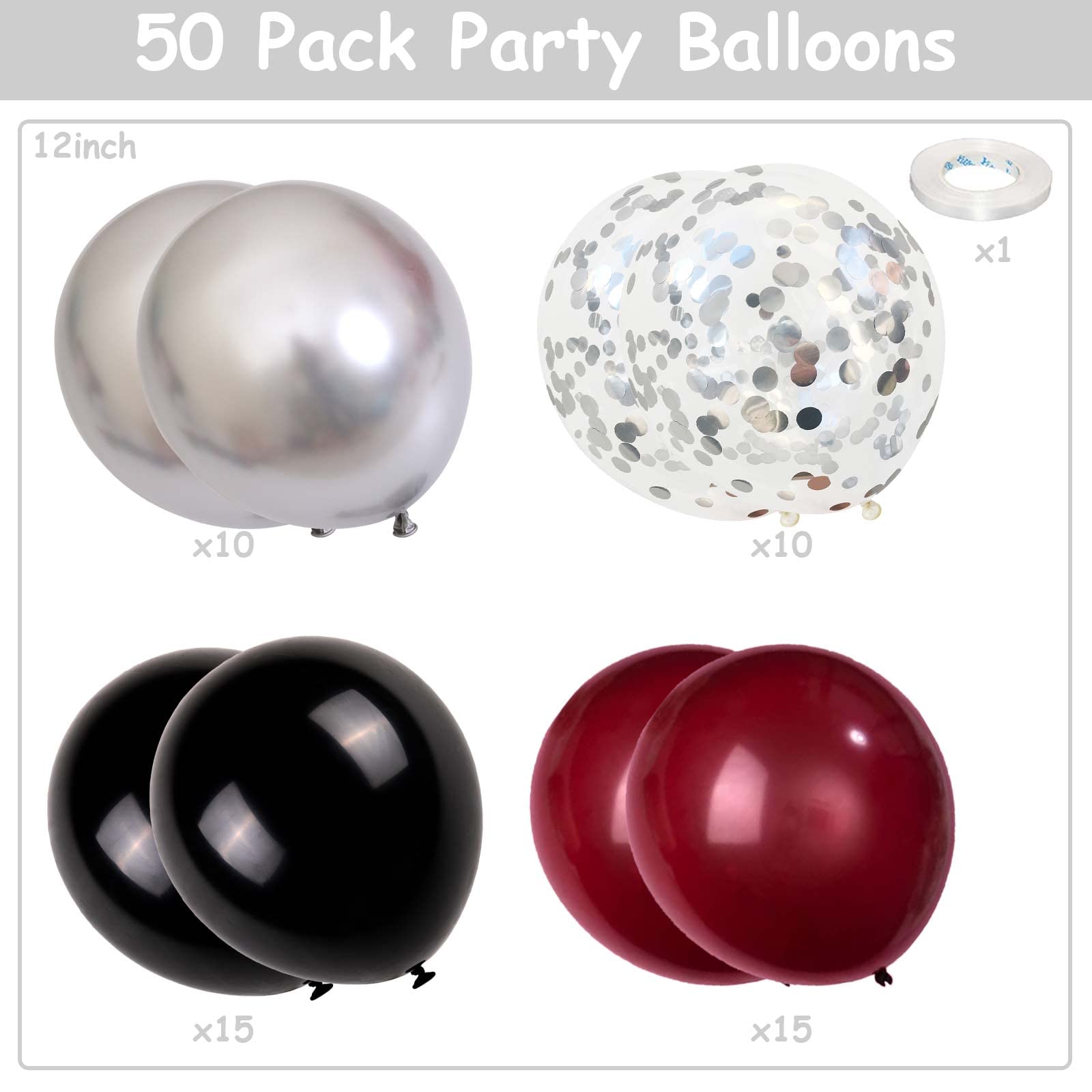 🎈 Burgundy Coffee Black Silver Balloons Set - The balloon kit has beautiful 12inch balloons in 5 different types: 15pcs matte black balloons, 15pcs pearl burgundy balloons, 10pcs metallic silver balloons, 10pcs silver confetti balloons and 1pc balloon ribbon. To make your party most memorable. Vibrant colors add to the party's color theme, which can catch the attention of people and take as a photo props, giving your guests a surprise and impressive party.