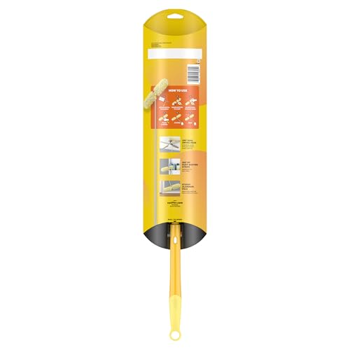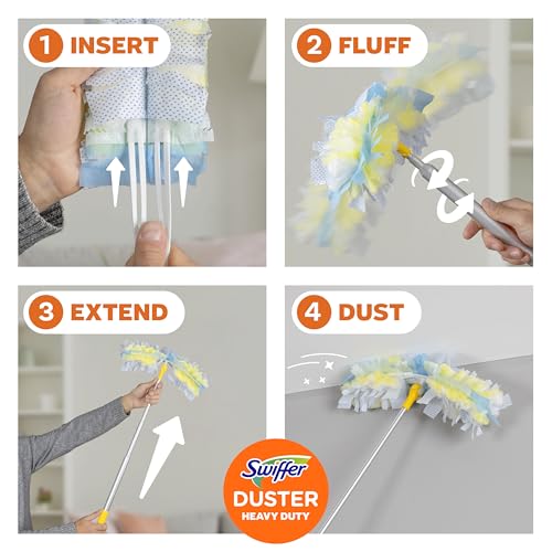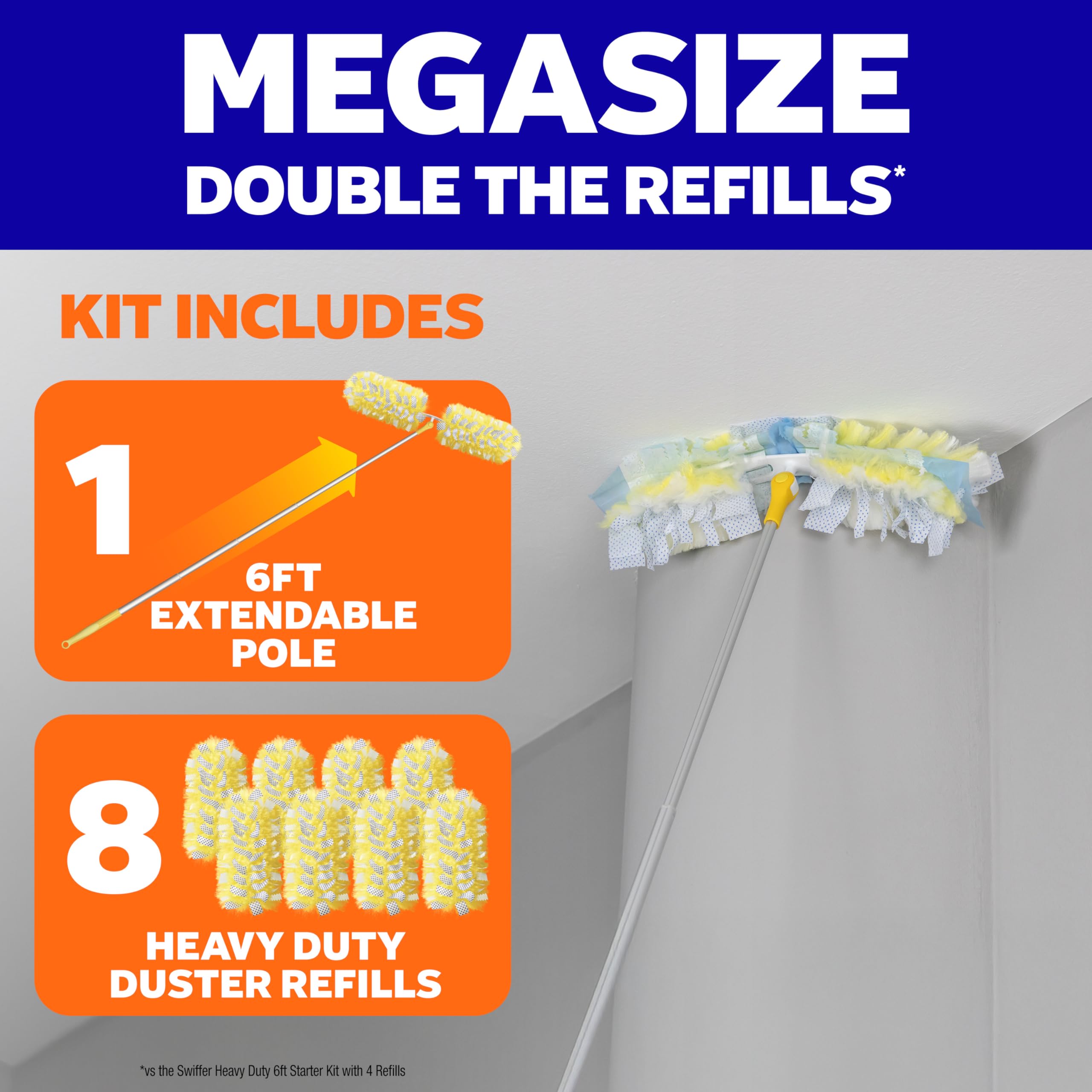 SWIFFER HEAVY DUTY DUSTER KIT with a 6 FT EXTENDER HANDLE Traps and Locks up to 4x more* dust.Heavy Duty Duster's 360° DESIGN has DUST-BUSTING STRIPS to break down layers of built-up dust, and thousands of fluffy, SPECIALLY-COATED FIBERS that grab onto dust in every direction. 6FT EXTENDABLE HANDLE makes it easy to clean hard-to-reach places, like fan blades, atop bookcases, and light fixtures. Easily clean blinds and around knickknacks. Refill Dusters available. *vs. Feather duster after 9 uses.