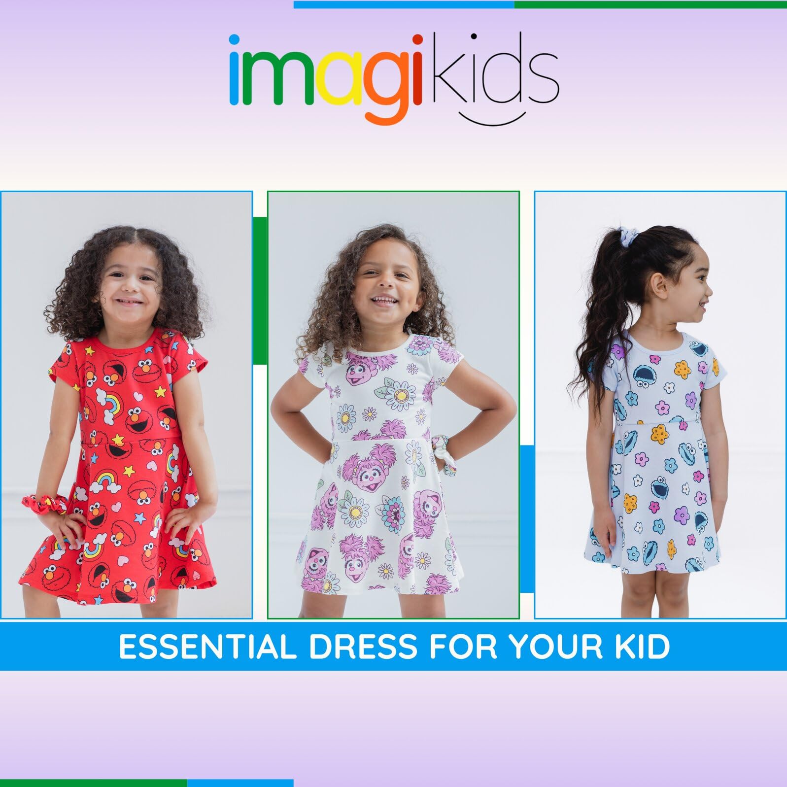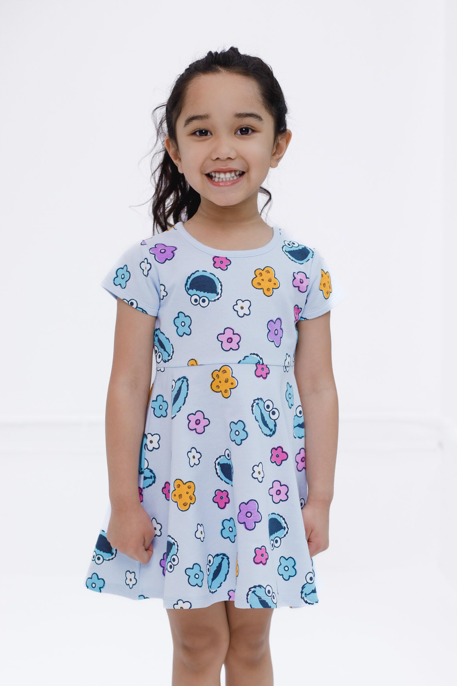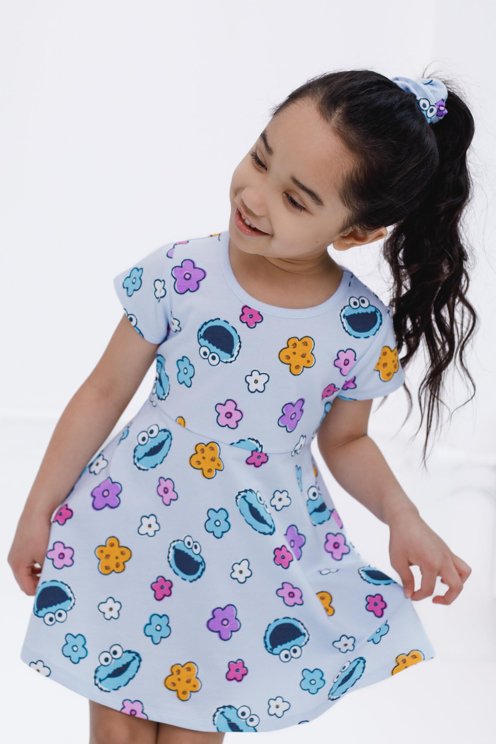 Description Dress your little one in this adorable Sesame Street outfit and watch them learn and play with their favorite characters! This cute short-sleeve dress features fun and colorful all-over print artwork of favorite characters like Elmo, Abby Cadabby, or Cookie Monster and comes with a fashionable matching scrunchie! Soft and stylish, this comfortable Sesame Street skater dress is made for all day adventure!