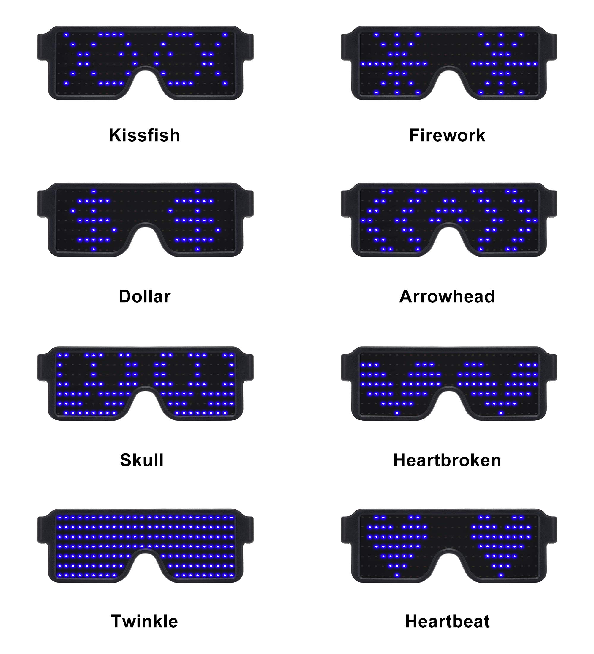 LED GLOWING GLASSES WITH 8 PATTERNS -- Fireworks pattern, Dollar pattern, Kiss fish pattern, Arrowhead pattern, Twinkle pattern, Skull pattern, Heartbeat pattern, Heartbroken pattern. Long press the button for 3 seconds to turn the glasses on/ off, short press the button to change the pattern. 164 pieces built-in LED bulbs make the glasses super bright and cool!