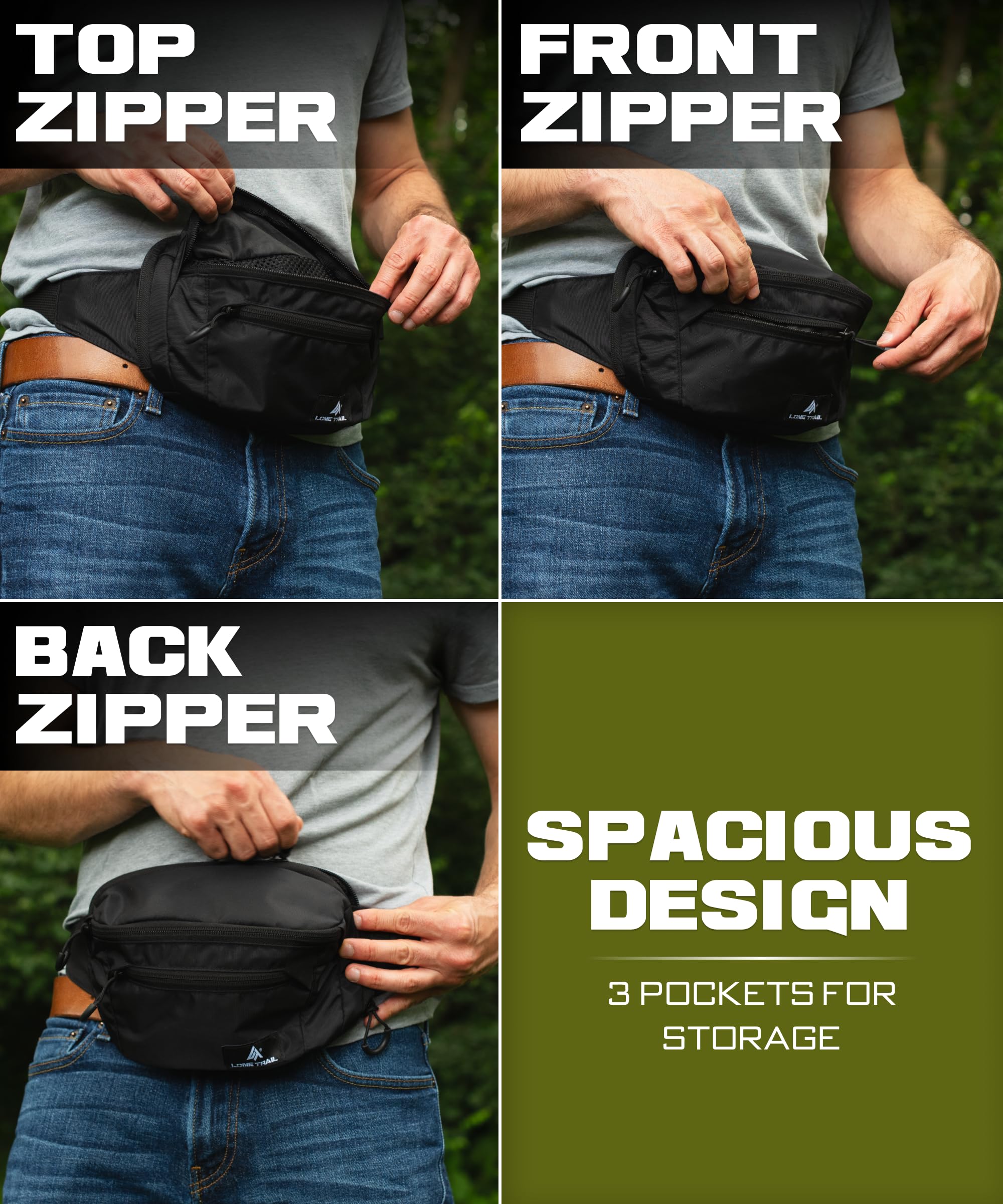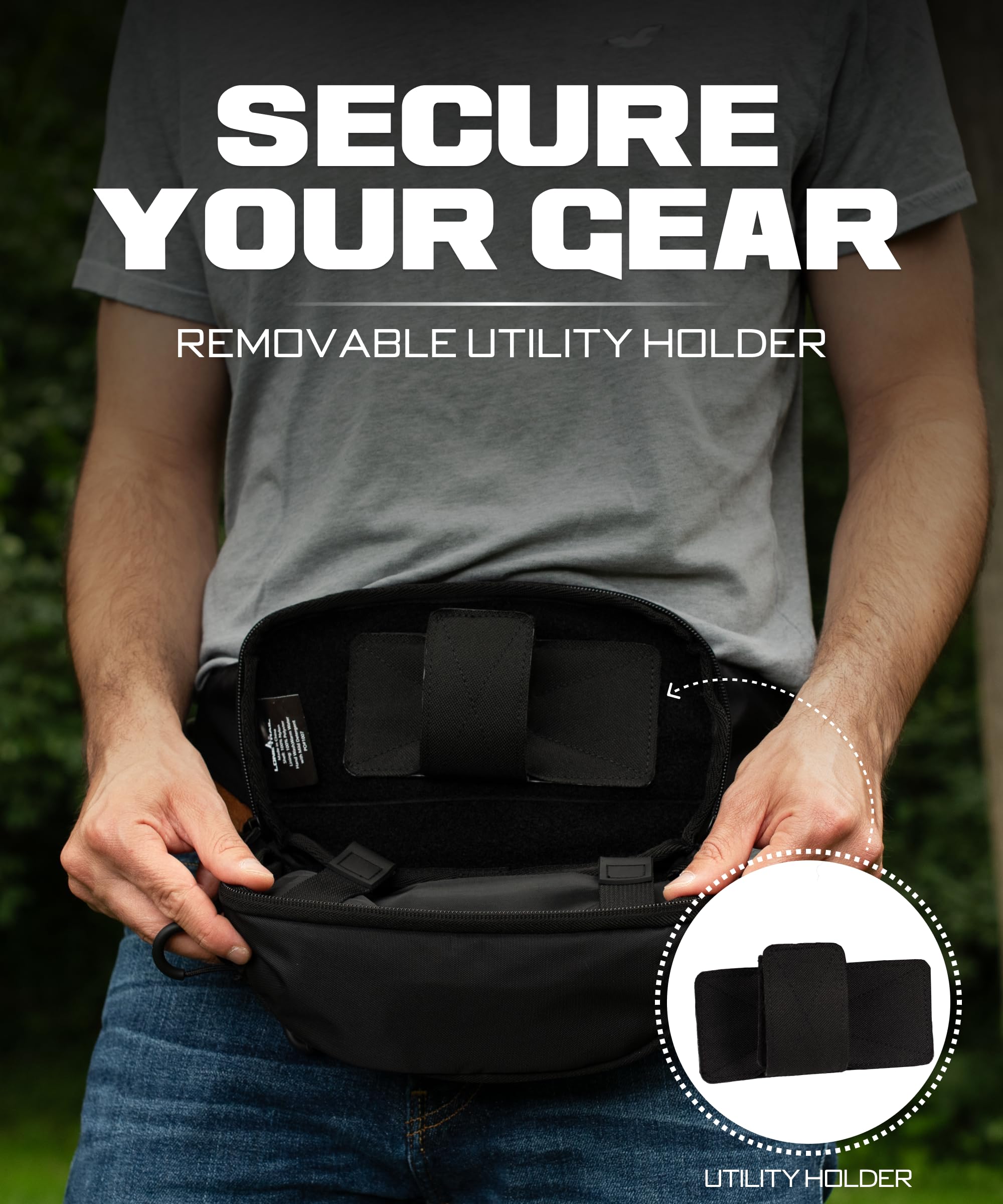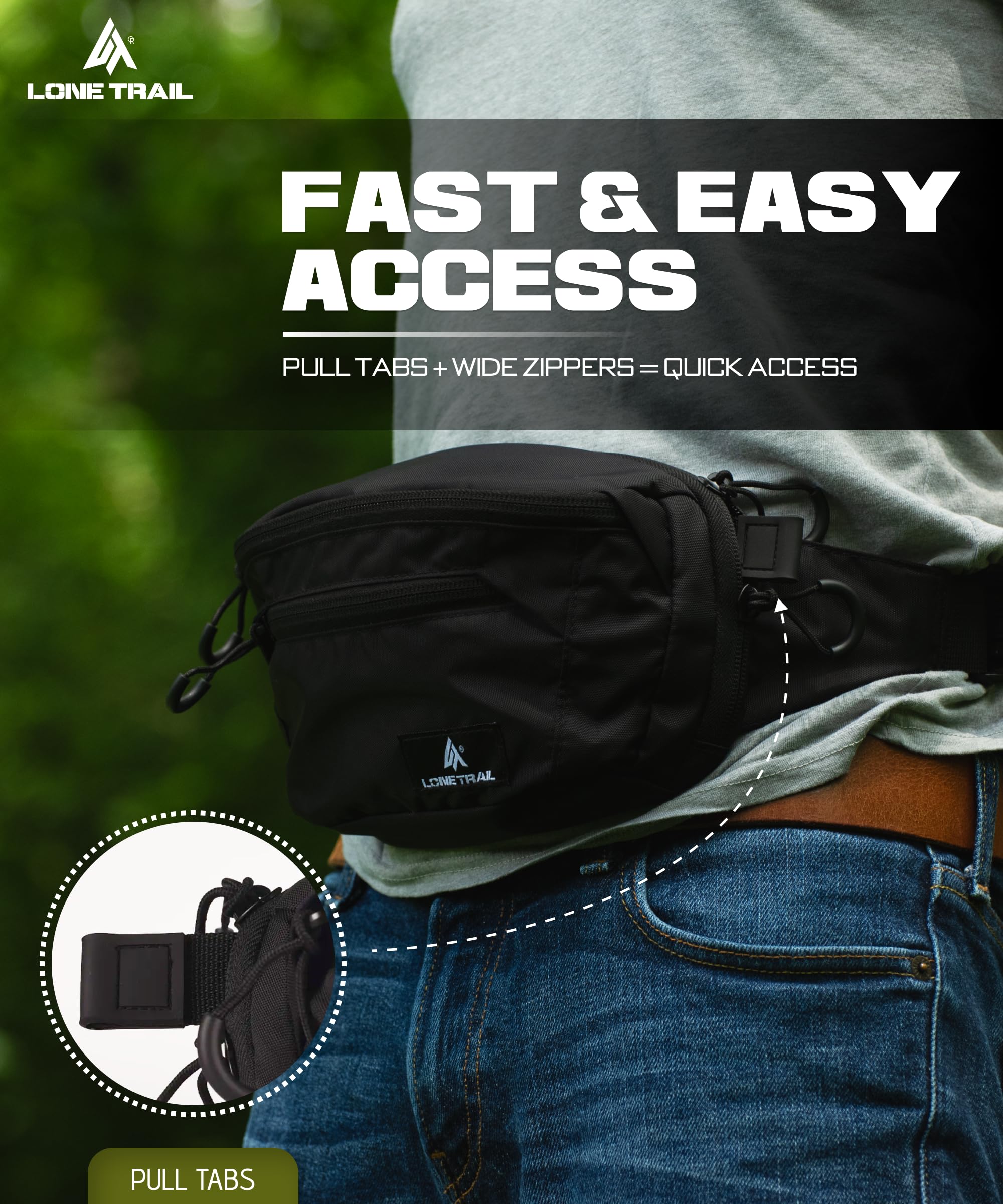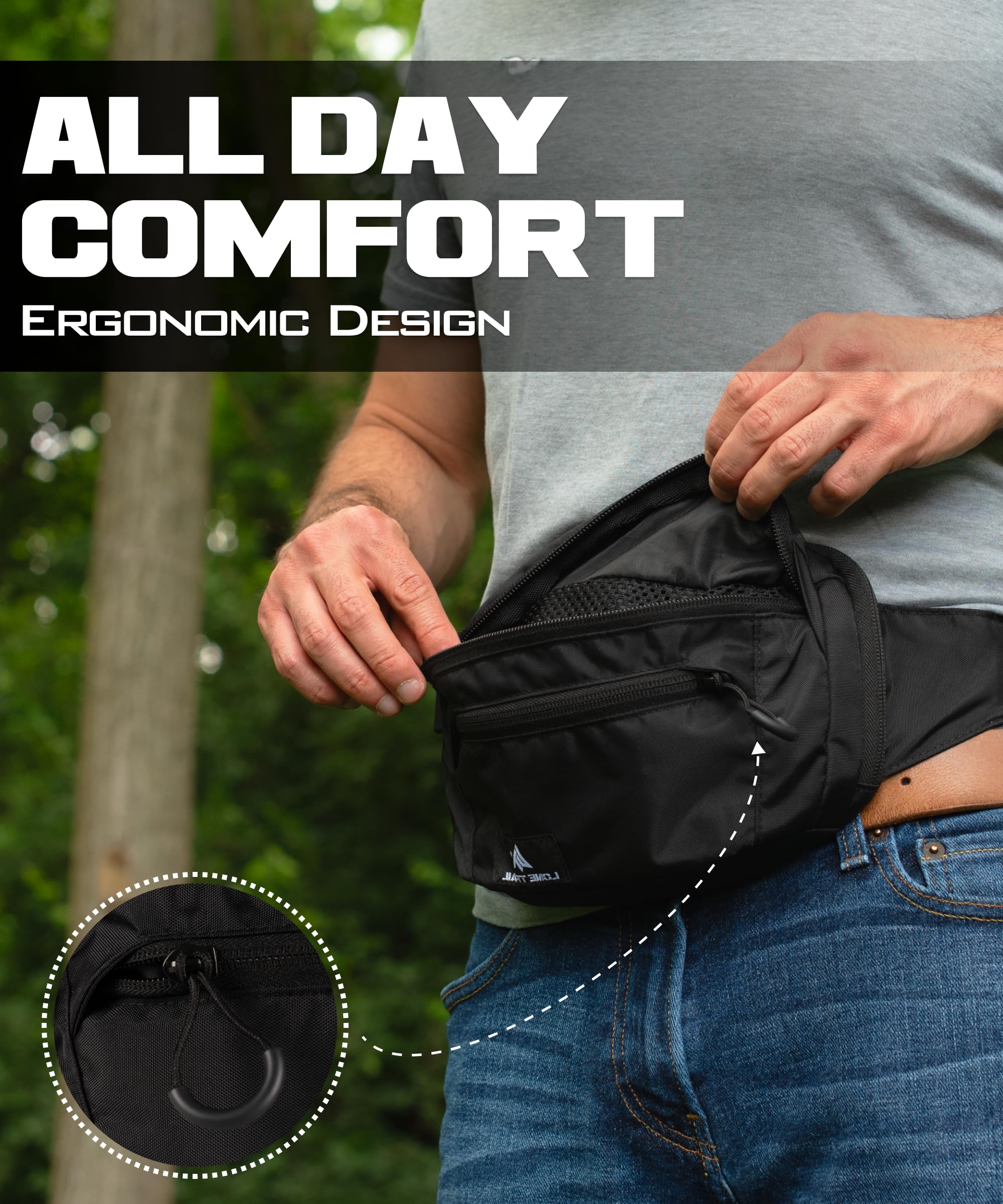 EDC fanny pack for men with secure rear carry: Rear zipper pocket with internal anchor strap locks down keys and security carry. Smooth pull tabs give instant access, a smart man fanny pack for those who don’t take chances.