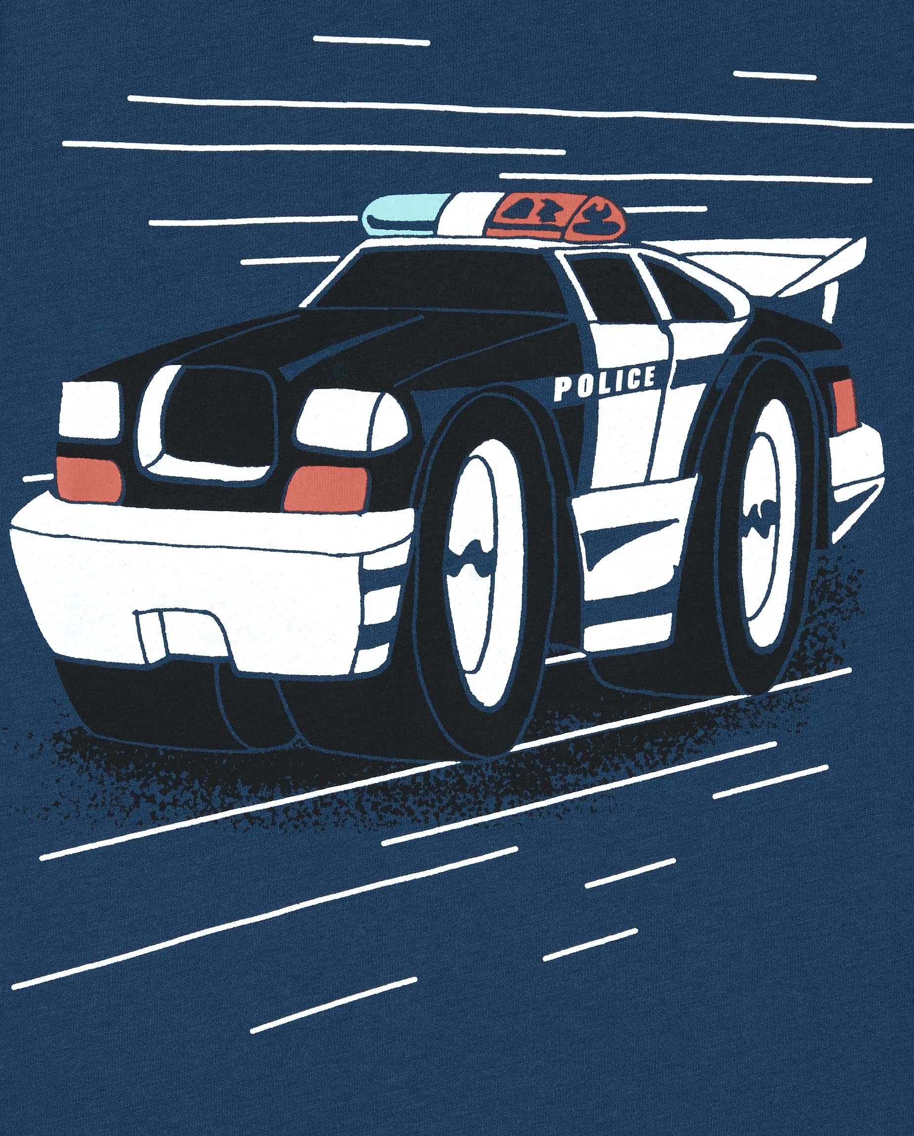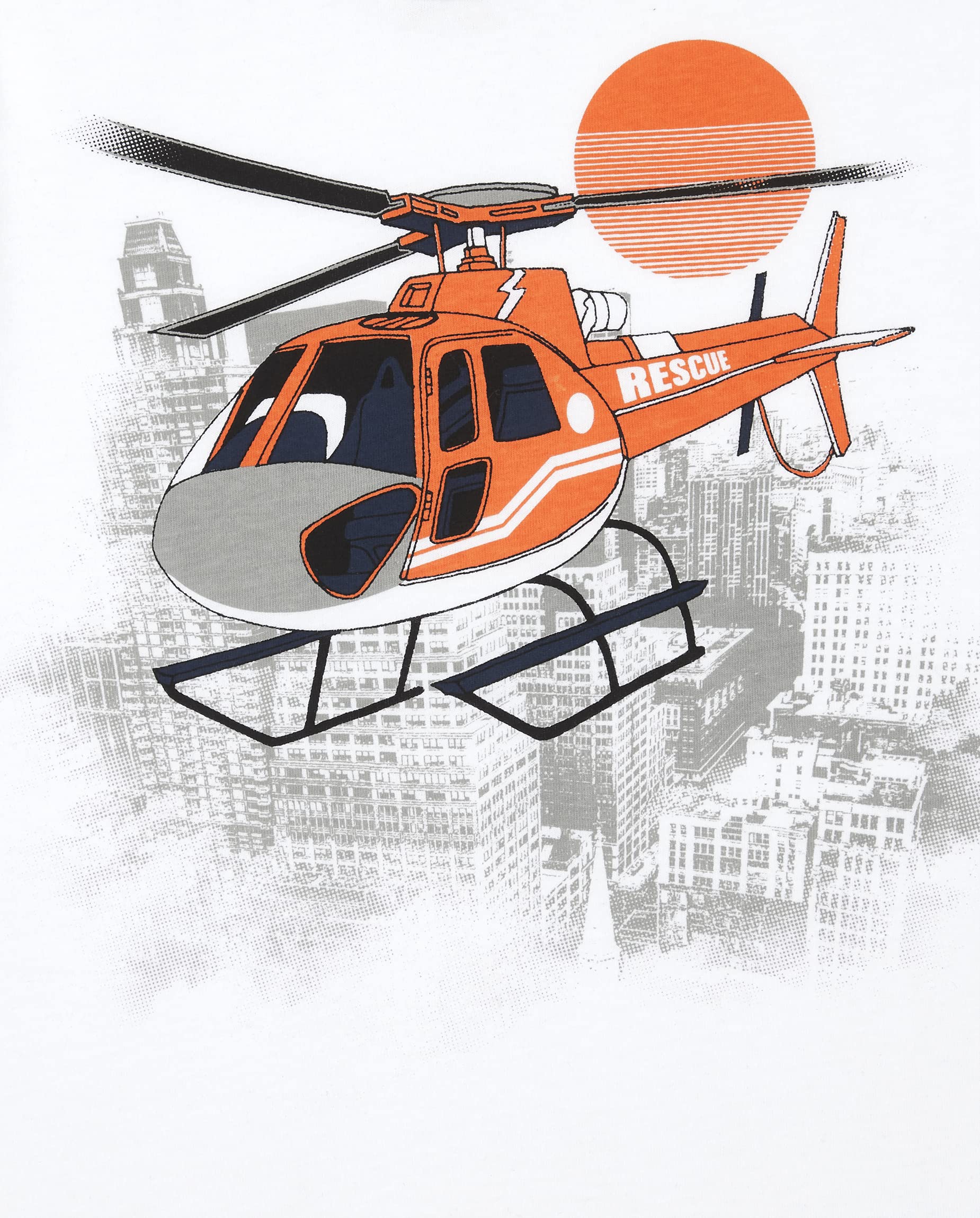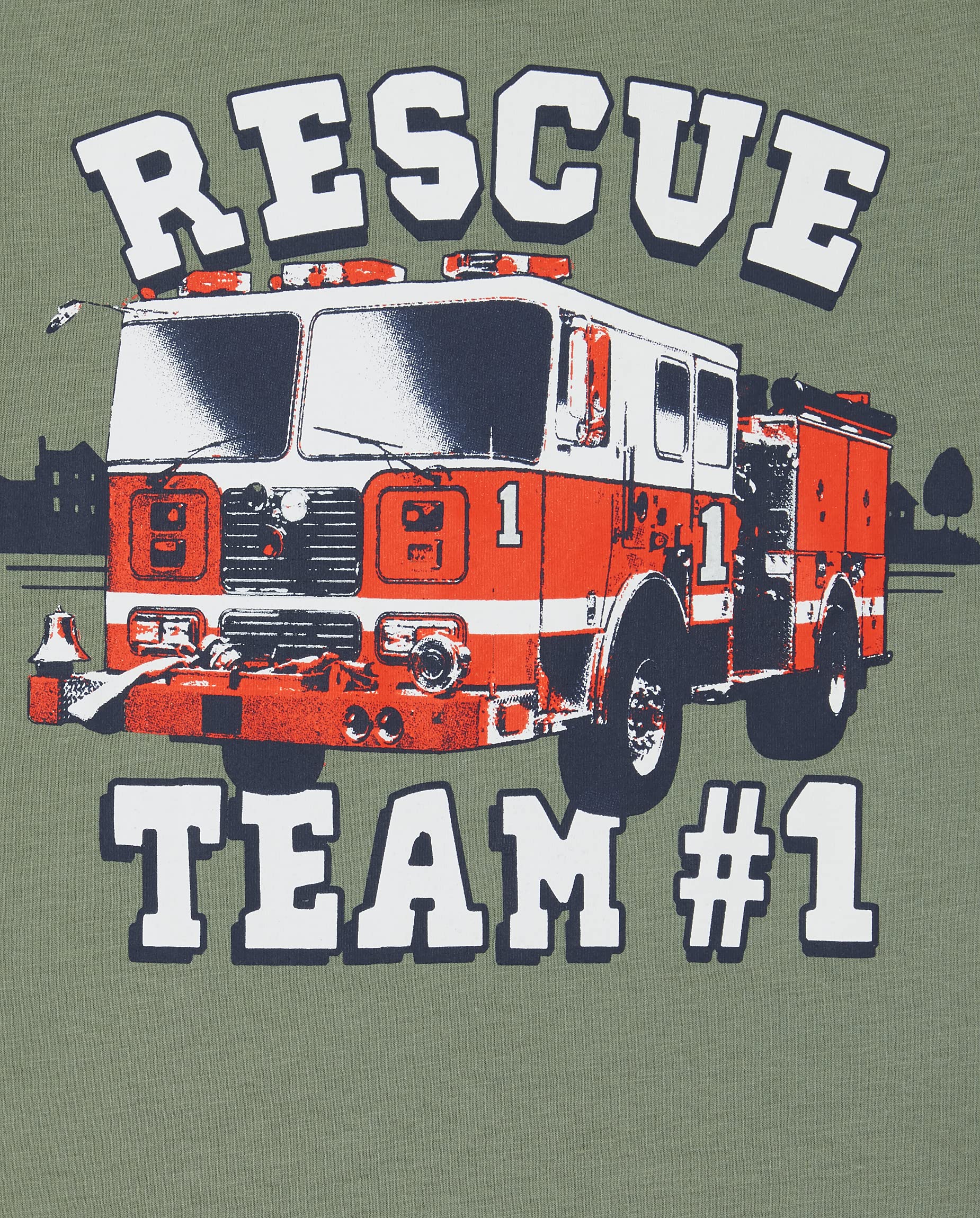 Pack of 3 graphic tees includes: 1 graphic tee with police car graphic design at front; 1 graphic tee with 'Rescue Team #1' and fire truck graphic design at front; 1 graphic tee with helicopter graphic design at front