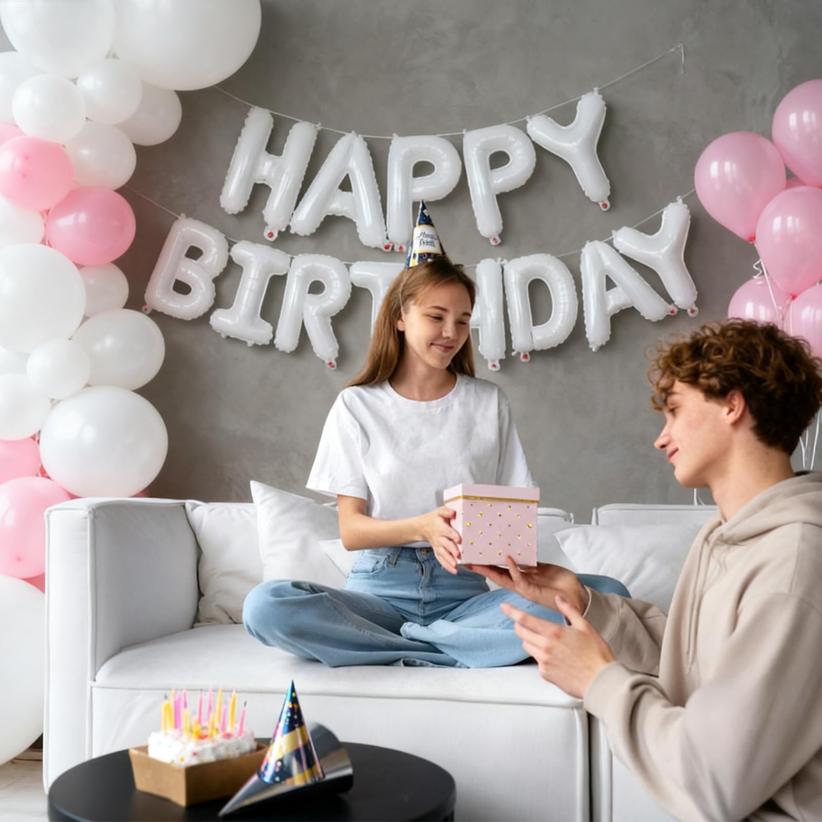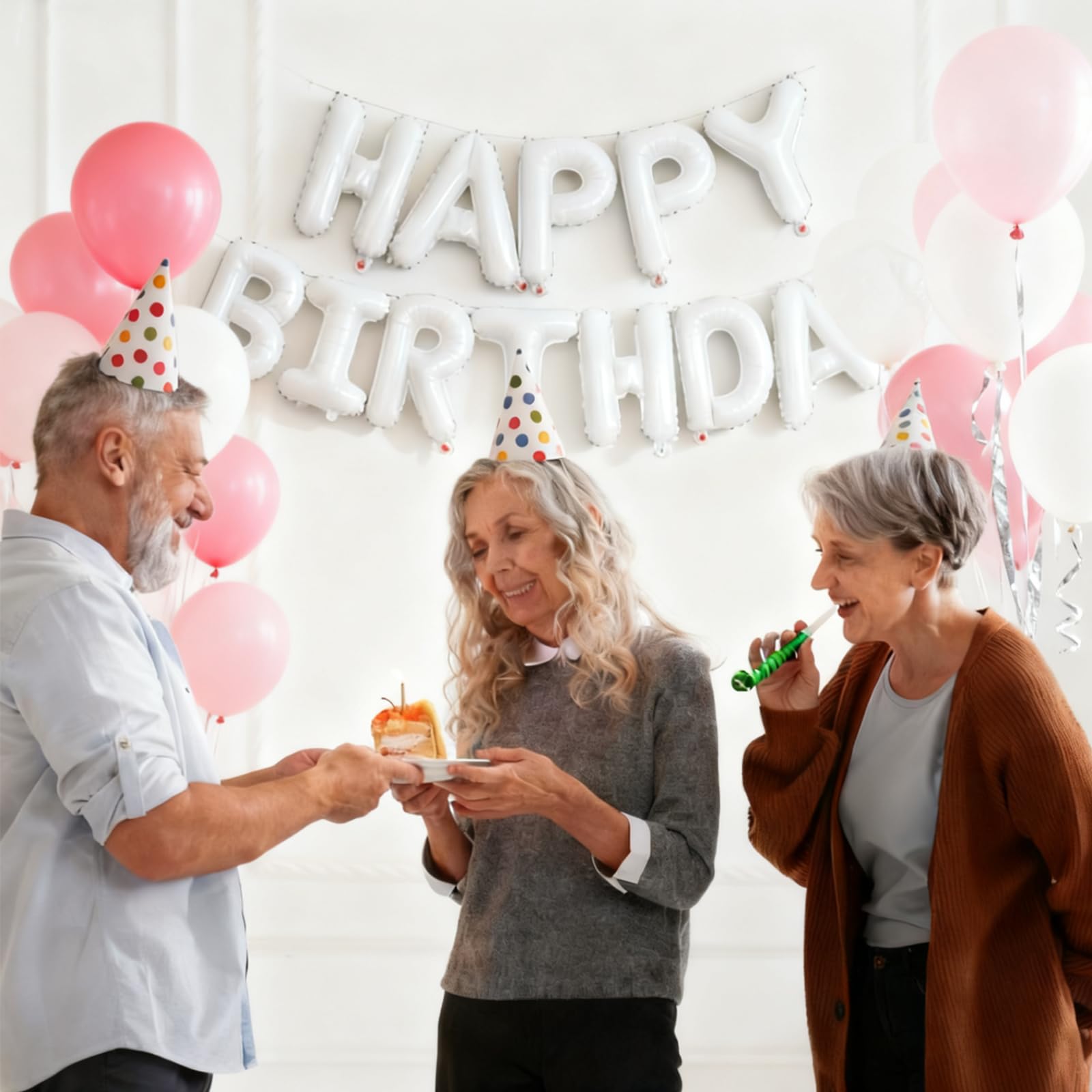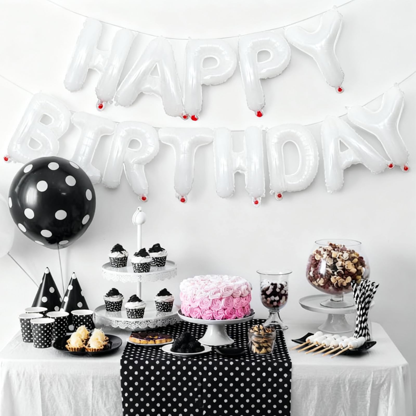 Premium Material: Aluminum foil balloons maintain their shape for 72+ hours without leaking. The bright white Happy Birthday letter balloon banner sign and wrinkle-resistant surface create an elegant birthday atmosphere background for adult parties.