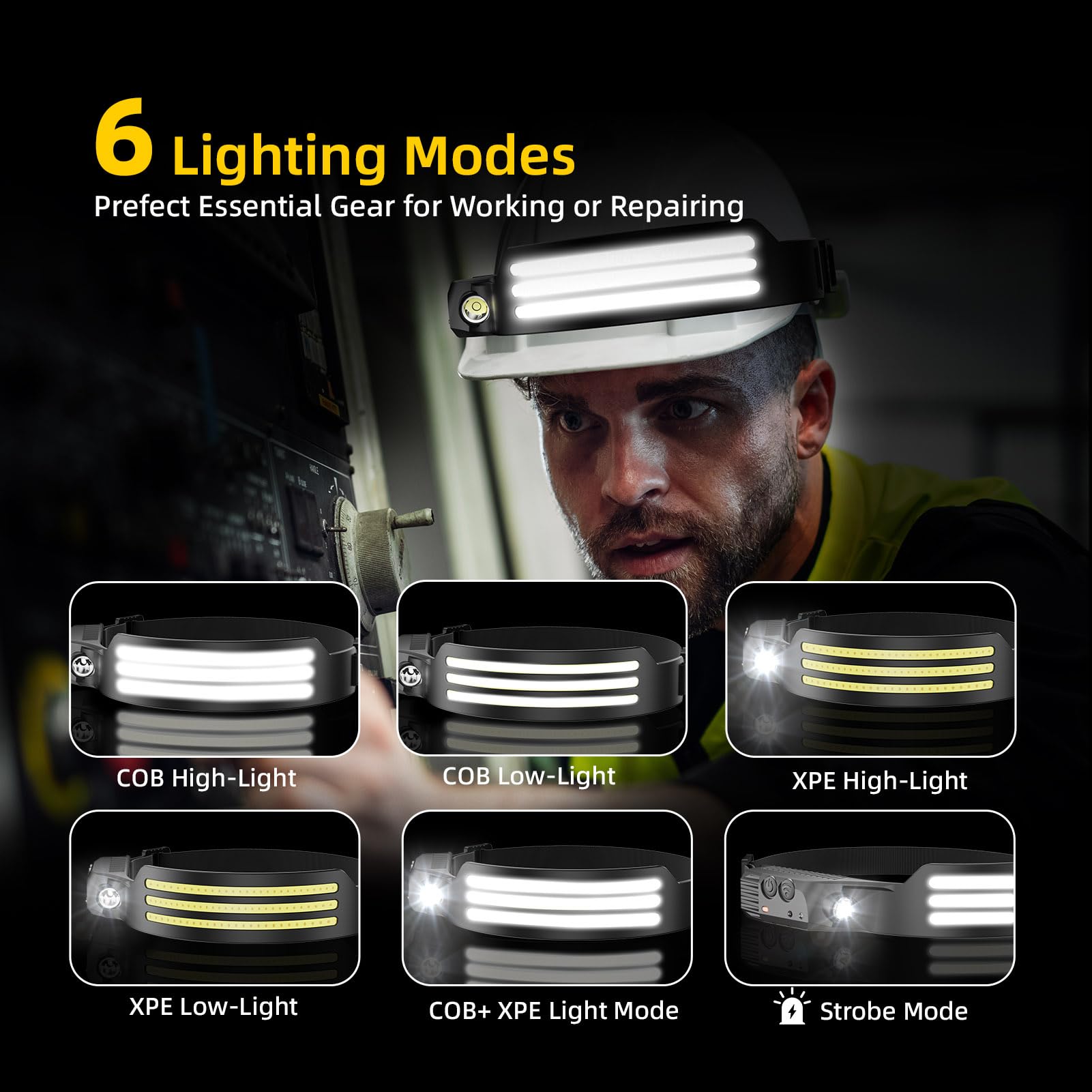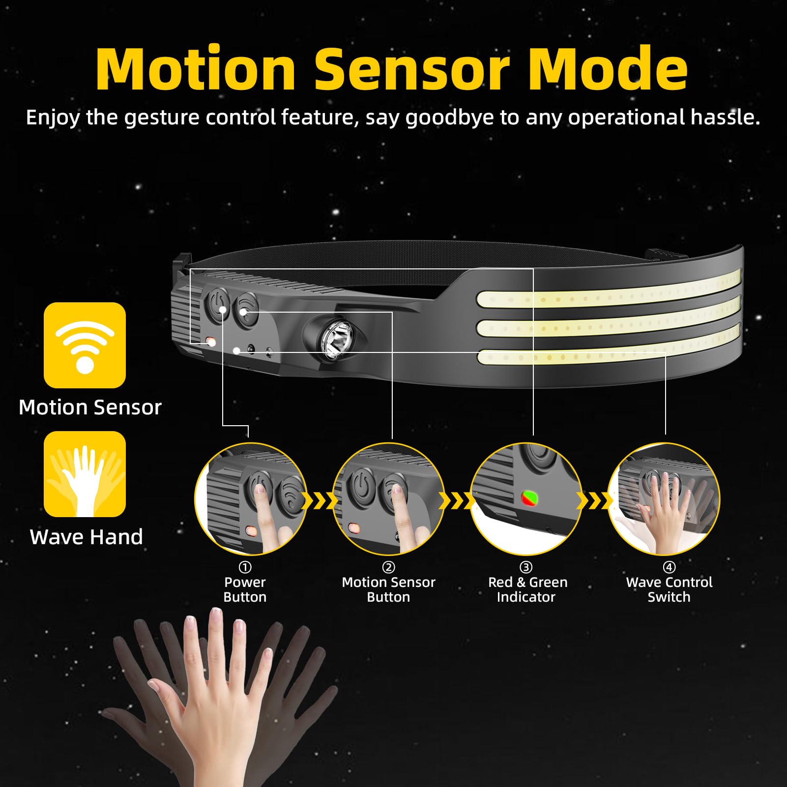 6 Lighting Modes & Motion Sensor: Eatelsin Headlamp have 6 working modes, including COB high-light, COB low-light, LED high-light, LED low-light, COB+LED light mode, and strobe mode, making it suitable for any situation. The Head lamp has motion sensor mode, just press the sensor mode button and wave your hand to control the head lamps easily. Enjoy the gesture control feature and say goodbye to any operational hassle.