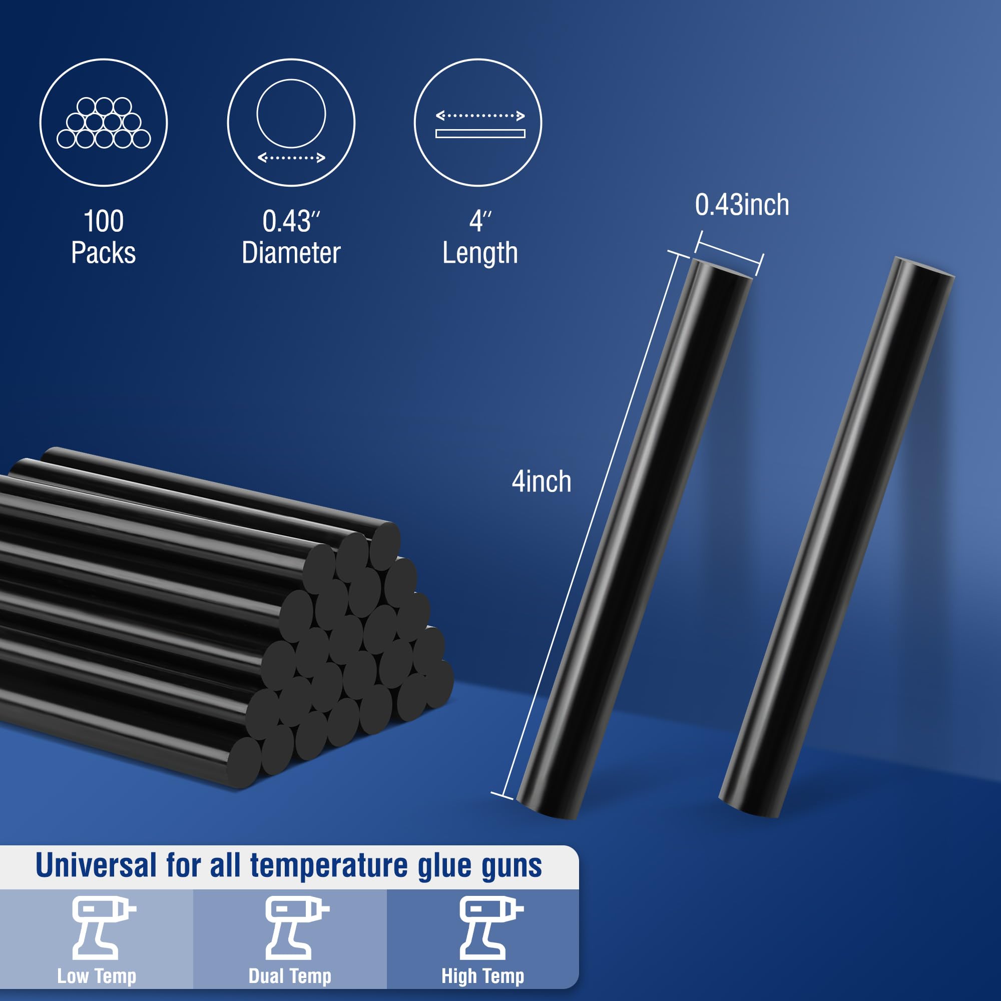 100 PCS Full Size Sticks: Comes with 100 packs of black hot melt glue sticks for most repair use, 0.43" diameter x 4" length full-size hot glue stick fits most glue guns on the market