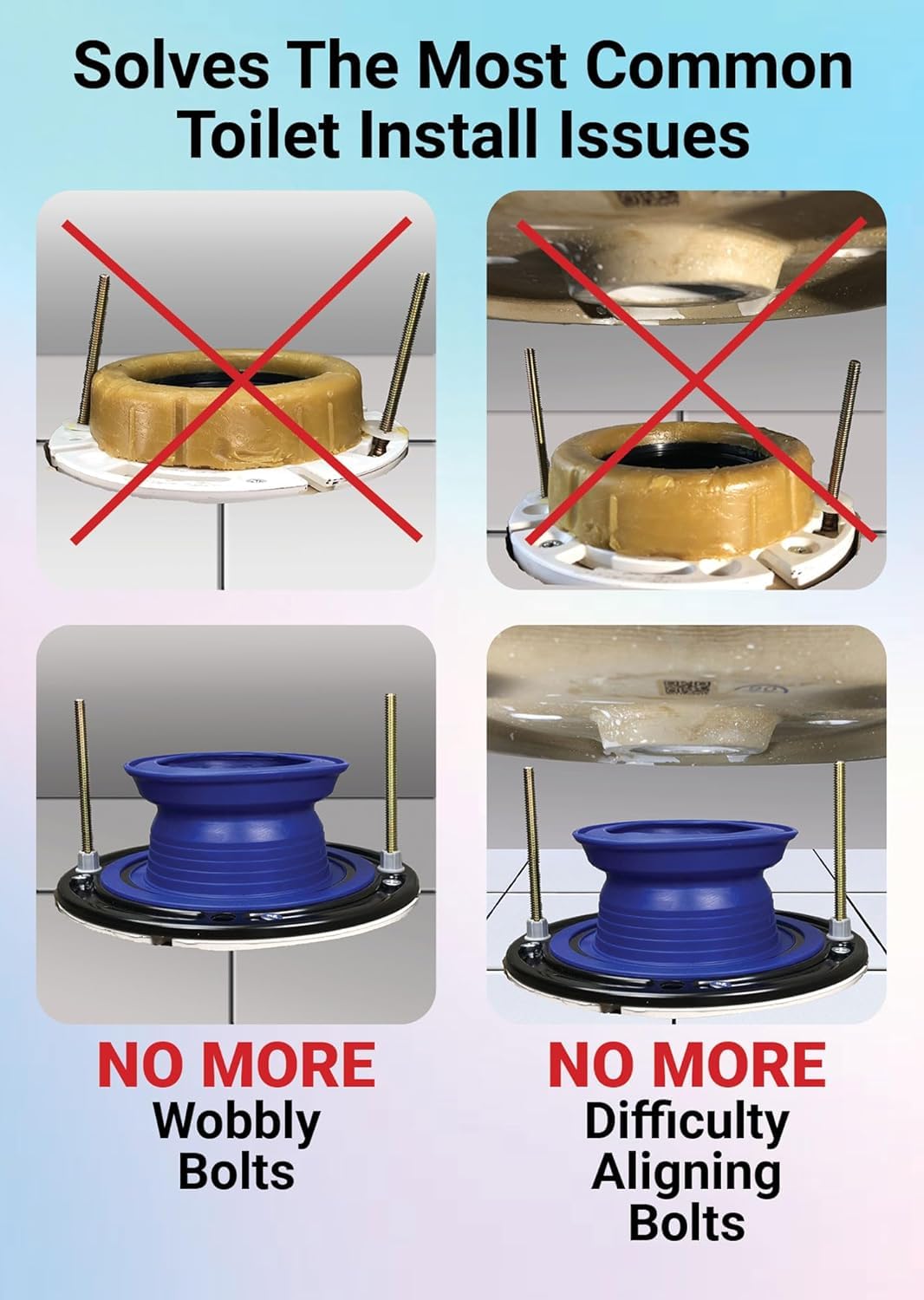 Peace of Mind | Toilet repair flange prevents wobbly toilets, or worrying if you have the right flange size. The waxless toilet ring, toilet installation kit, repairs all types of toilet flanges (PVC toilet flange, metal toilet flange, offset toilet flange, small cast iron, large cast iron, sioux chief, oatey toilet flange, rv toilet flange or any type of closet flange.