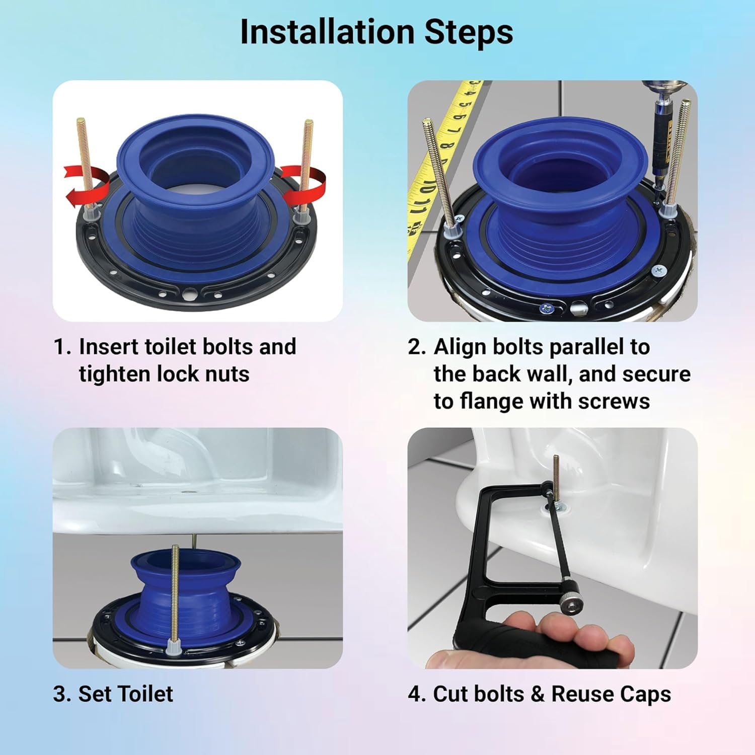 No Hassle | The One and Done toilet flange seal is a toilet replacement kit that includes a strong toilet flange, toilet screws, and toilet bolts. Toilet flange bolts, with a toilet lock nut, easily aligns the toilet bolts for floor with small openings for the toilet screws. The toilet ring replacement kit installs over low or a broken toilet flange. The toilet kit locks the toilet ring seal to the flange, centering the flange kit with the toilet and toilet drain. No need to use a toilet flange removal tool or toilet bowl wax ring. No more struggling to align the toilet and toilet seal, or loose / wobbly toilet.