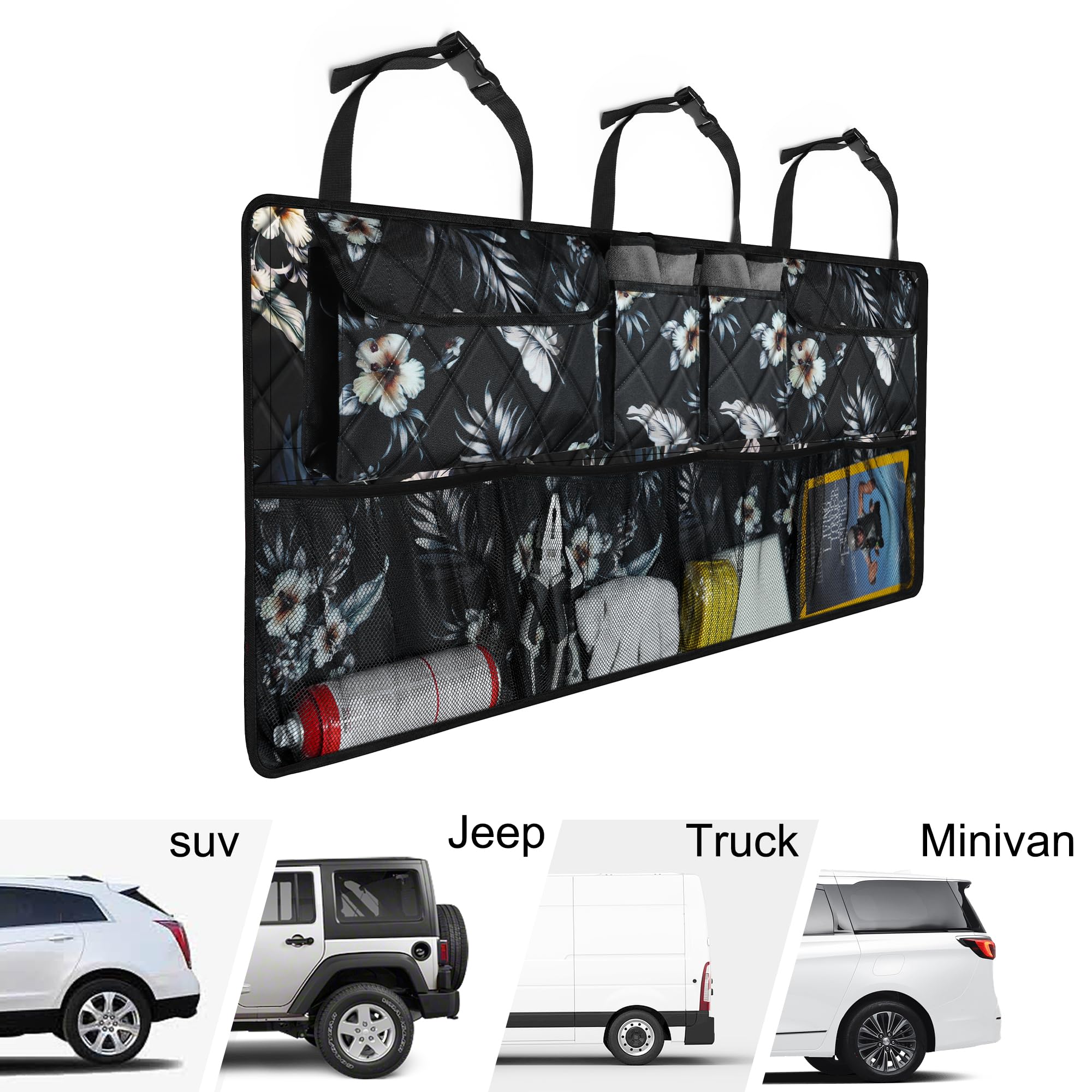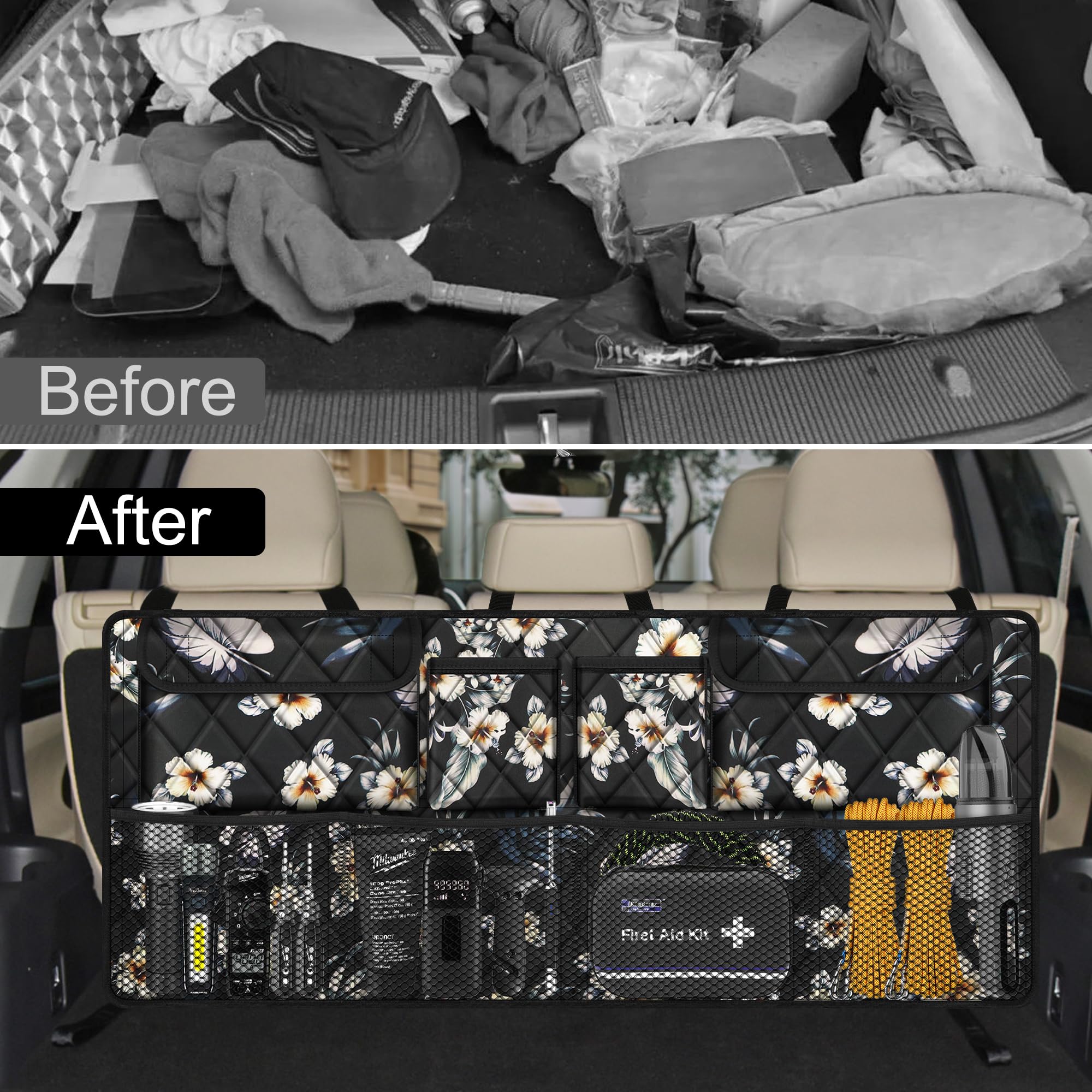 【Upgrade Size】: Improved design for car organizer size to meet more car models and storage needs. The size of the backseat trunk organizer has been changed from about 30 inches to 44 inches, providing more storage space, four cloth pockets and four mesh pockets.Ideal for keeping your car neat and organized.