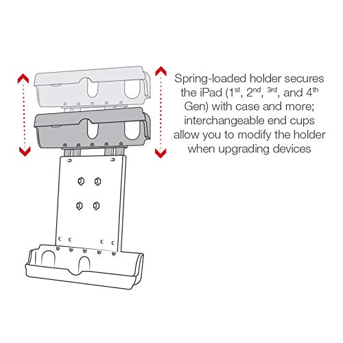 Spring-loaded holder secures 9" tablets with heavy-duty cases; interchangeable end cups allow you to modify the holder when upgrading devices