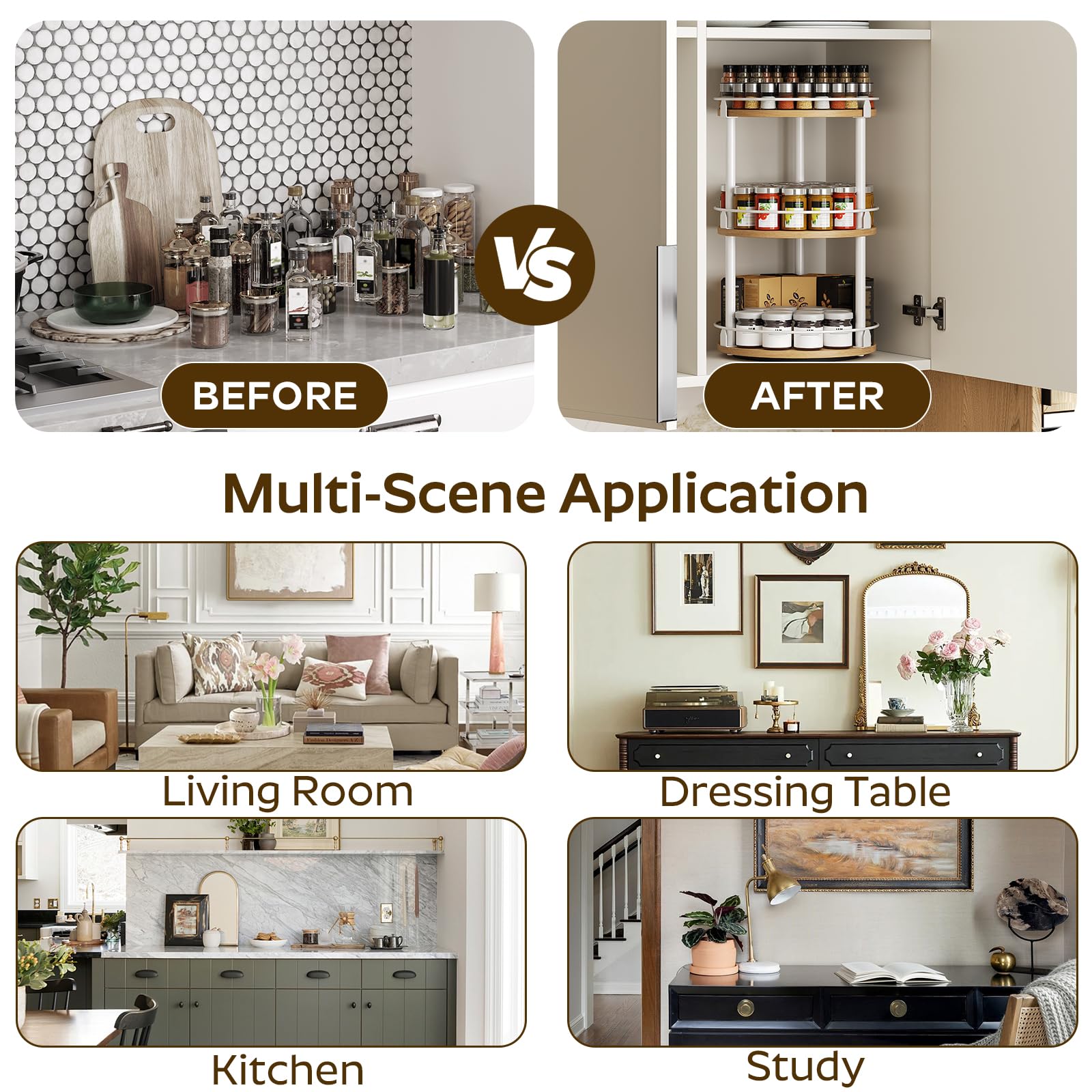 Reduce Countertop Pressure: It is multifunctional. On the kitchen countertop, it keeps spice jars close at hand to make cooking fun. On the vanity table, it holds your beloved pieces. At the dinner table, you can easily "spin" to get your favorite