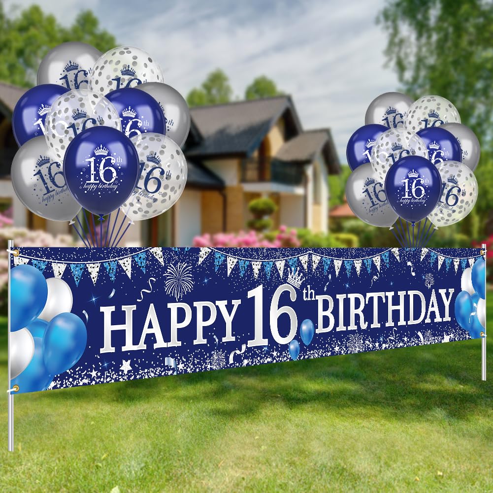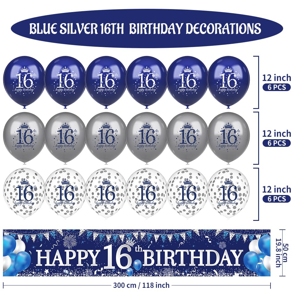💖【16th Birthday Decorations Set】Our 16th birthday Decorations package contains a large blue silver happy 16th birthday banner and 18pcs birthday balloons with a ''16th Happy Birthday'' pattern. The 16th birthday banner measures 300*50cm/118x19.8Inch, large enough for you to decorate your party. It is very suitable as a decoration for your 16th birthday party decorations, give a unique glow to your party