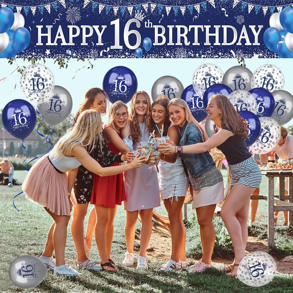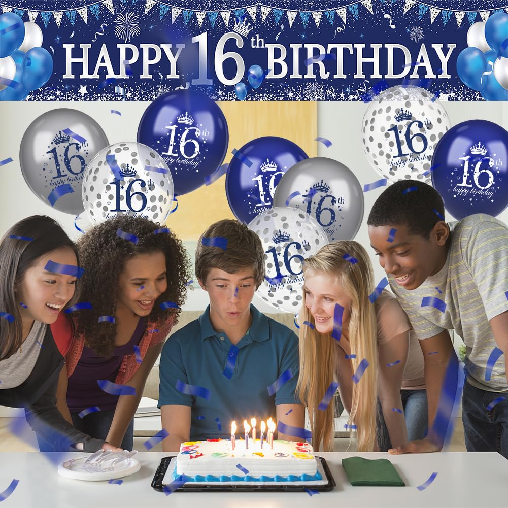 🥳【Perfect 16th Birthday Decorations for Boys Girls】The 16th birthday decoration for boys girls is featured with blue and silver elements, balloons of three types, they are blue and silver latex balloons and confetti balloons, decorate your party with our 16 birthday decorations that will be a big hit at your party