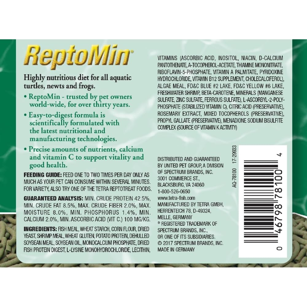 Tetra ReptoMin Floating Food Sticks is a scientifically formulated, highly nutritious daily diet for all aquatic turtles, newts and frogs. This easy-to-digest floating food contains precise amounts of nutrients, calcium and Vitamin C to support your pet’s vitality and good health. Feed 1 to 2 times per day, only as much as your pet can consume within several minutes. For variety, supplement this diet with a Tetra ReptoTreat food.Knowing what to feed your small aquatic pet depends largely on its species. If you do your homework, feeding your reptile or amphibian a healthy diet will be simple. Is your pet an herbivore, carnivore or omnivore? Does it eat every day? Does it need dietary supplements? Do your research carefully on your pet so you can be sure it’s getting the nutrition it needs.Tetra ReptoMin products are trusted by pet owners to meet the needs of their exotic animals. Since 1951, Tetra has developed the world’s most comprehensive body of fish food knowledge, and fishkeeping enthusiasts have looked to the brand for products and solutions that add ease and beauty to their home. Whether you're an experienced hobbyist or just starting out, Tetra has everything you need – from a large variety of quality fish food and innovative equipment to test kits and decor.