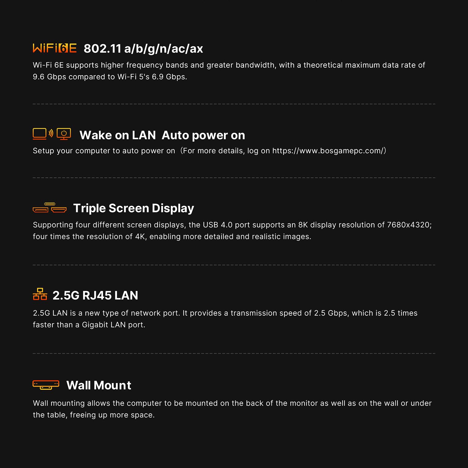 【RJ45 2.5GbE LAN & WiFi 6E】Bosgame Mini Computers USB4 port supports PD 3.0 (up to 100W), meaning you can power the Bosgame P3 Lite conveniently for portability. Features dual 2.5GbE LAN for complex networks (firewalls, routers) and WiFi 6E for faster, stable connections. Includes Bluetooth 5.2.