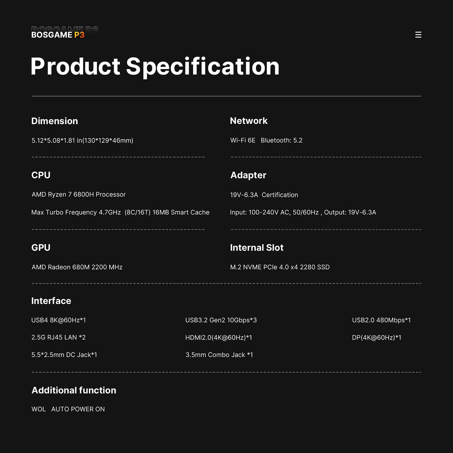 【Powerful Ryzen 7 6800H Processor】BOSGAME P3 Lite Mini PC features the AMD Ryzen 7 6800H processor with 8 cores and 16 threads, up to 4.7GHz, and Radeon 680M GPU (1900MHz). Ideal for design software (Photoshop, Premiere, CAD) and popular games like PUBG, LOL, and PS3 emulators.