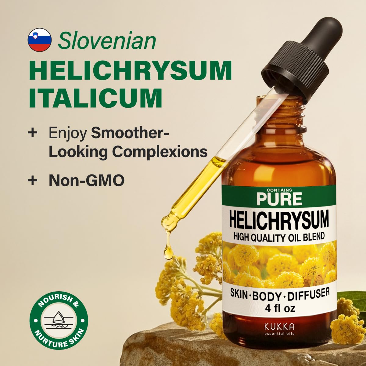 Experience premium quality helichrysum oil. Sourced from Slovenian helichrysum flowers, this cruelty-free, non-GMO oil elevates self-care routines. Versatile addition for skin care collection.