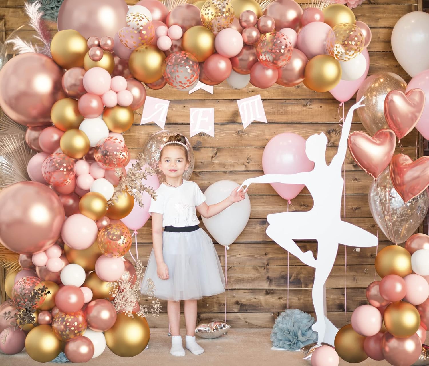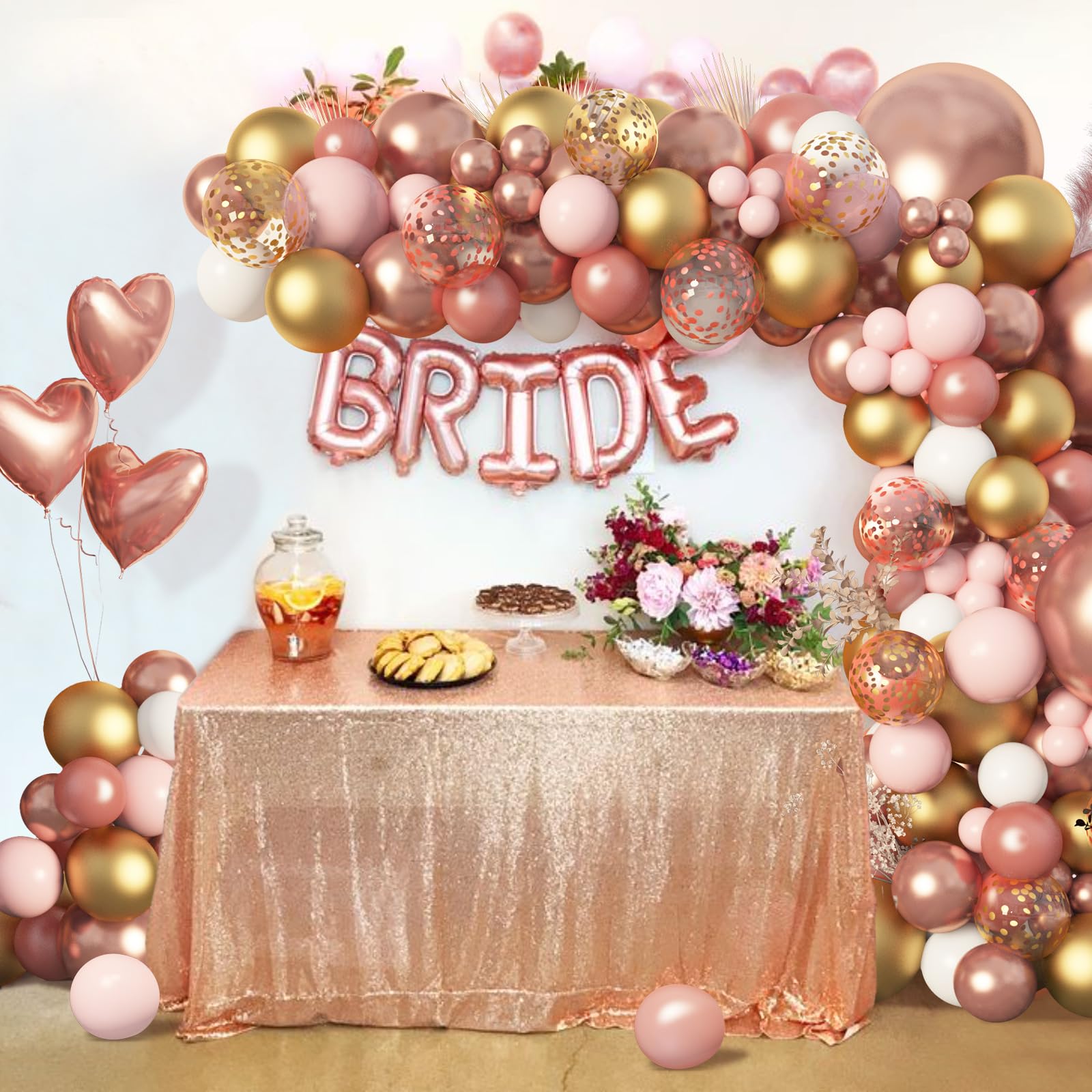 Rose Gold Balloons Garland Arch Kit: Includes 140 pcs rose gold/rose gold metallic/baby pink/rose gold confetti/gold confetti/gold metallic/white balloons, 6 pcs rose gold heart foil balloonsa and 4 pcs balloon tools
