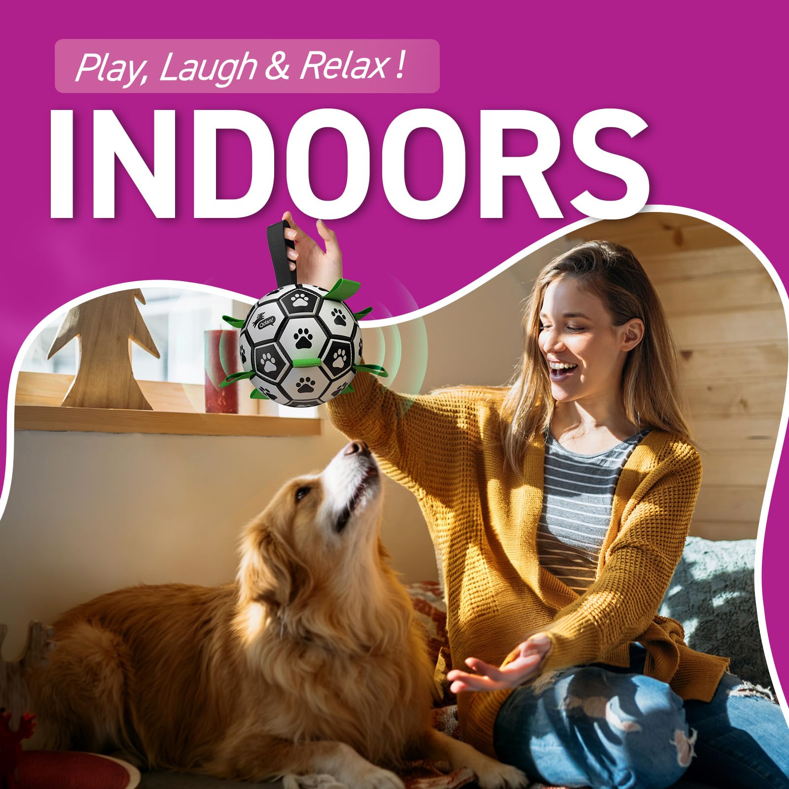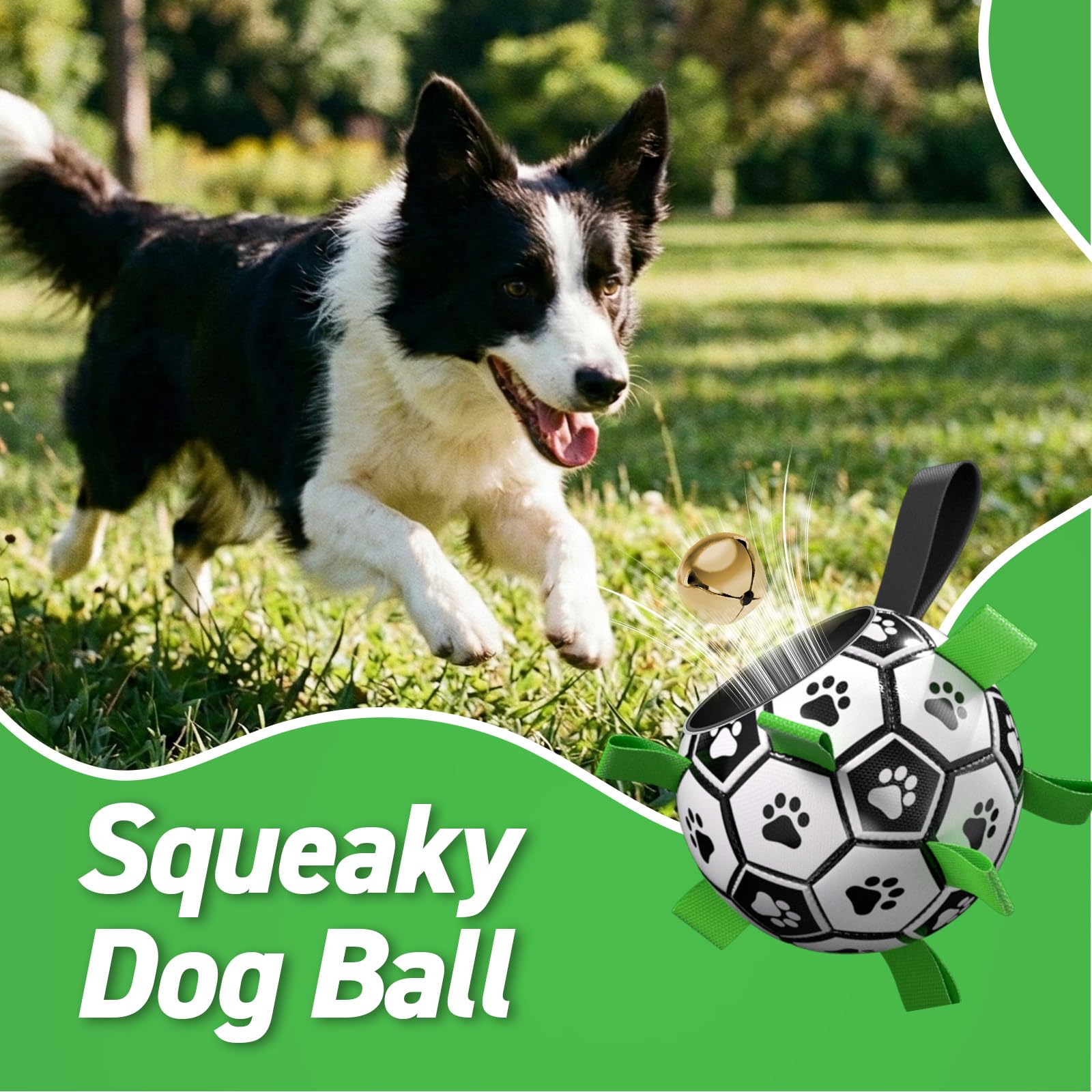 Dog Soccer Ball with Bell inside: our doa soccer balls makes a fun bell sound as it rolls. satistying thedog's curioslty to play a long time, tell your dogs you're ready for dog games by making bell sounds. BTw, this dogloy can be played indoor & ouidoor, like living room, park, backyard, beach.
