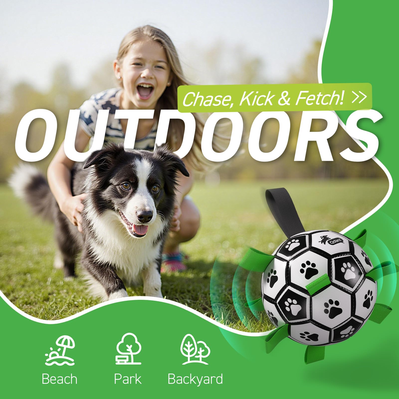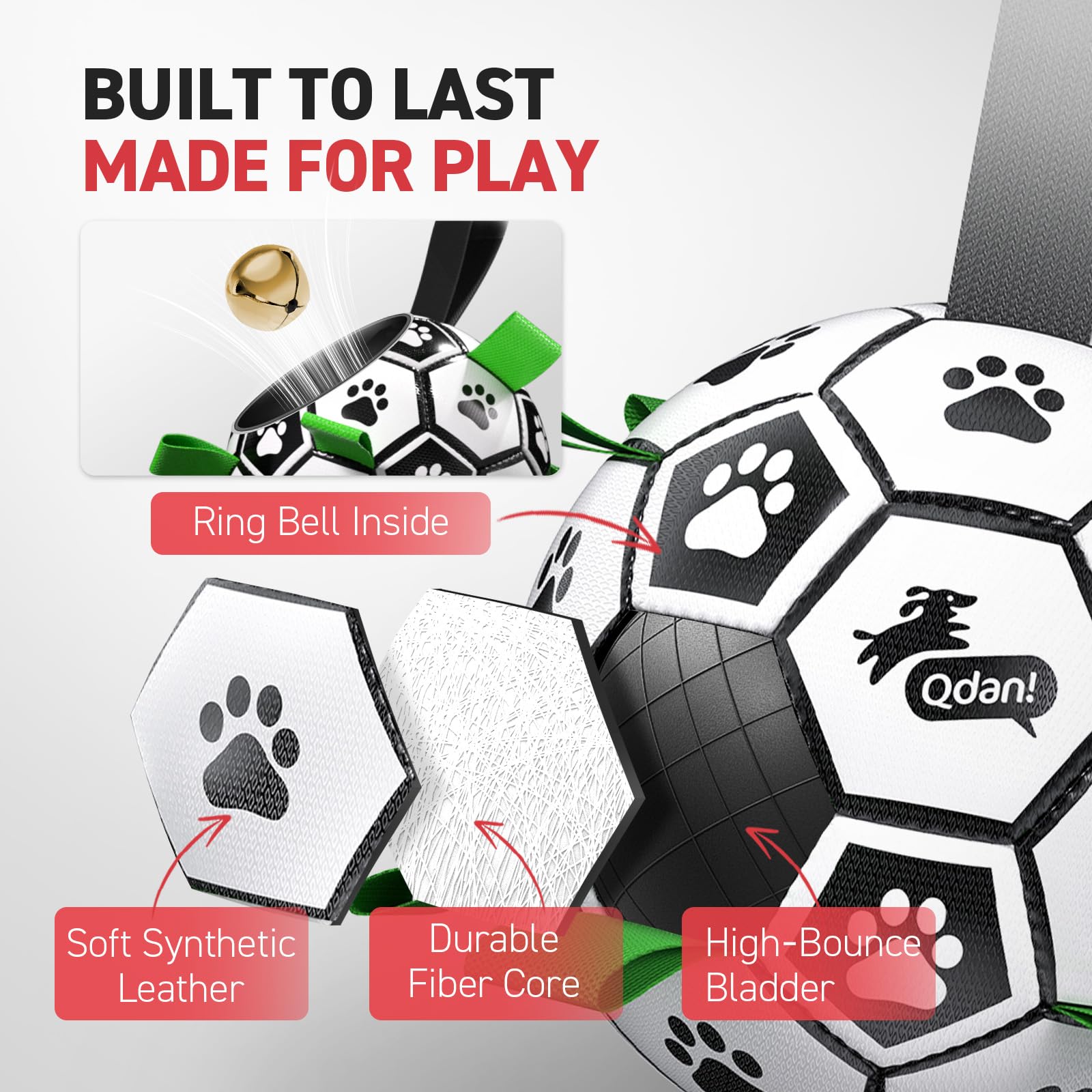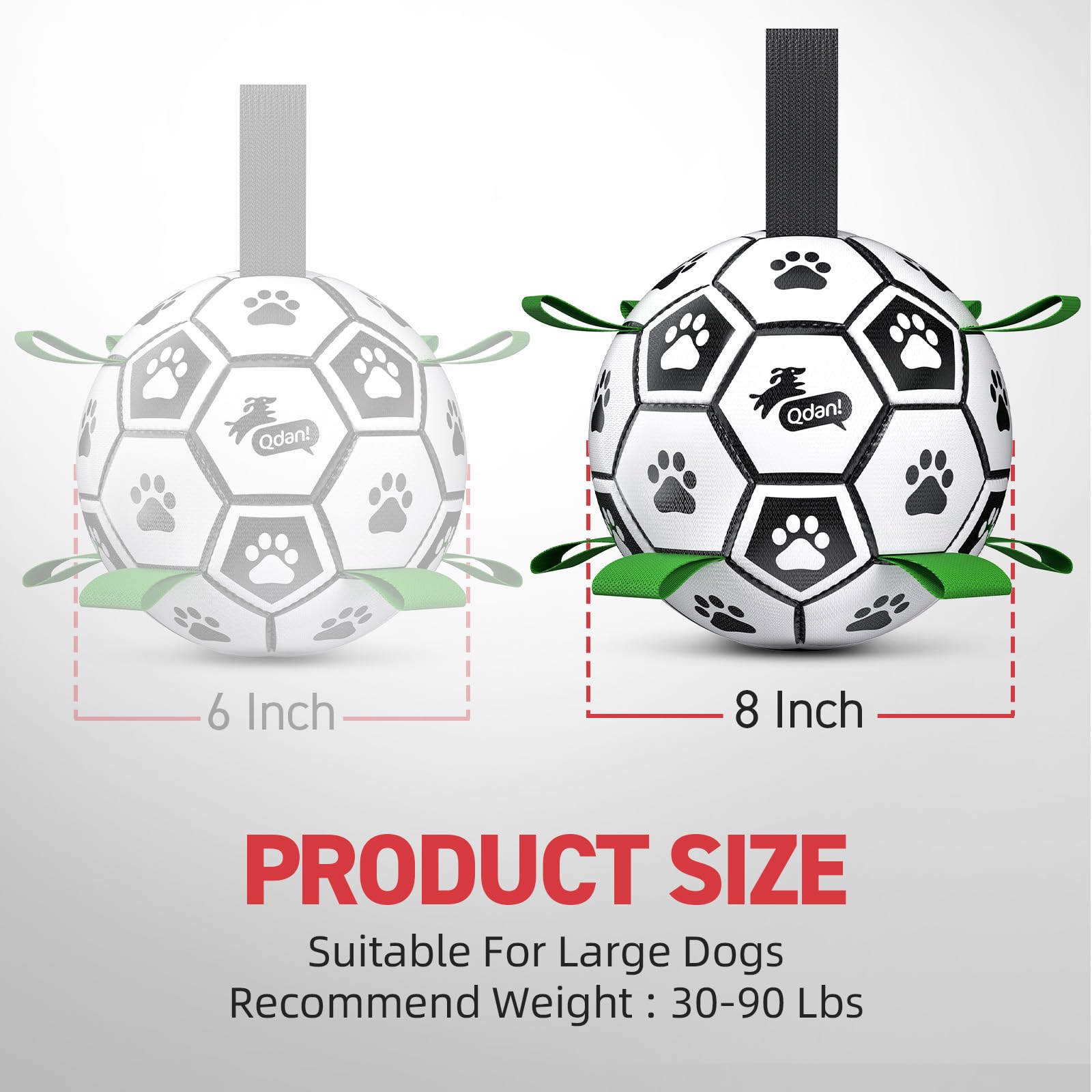 Upgrade interactive Dog Toy: Dog soccer ball with nylon tabs sewn evenly into the seams not only create an erraticbounce that dogs love to chase, but also make lt easler for the dogs to fetch, toss, tug and retrleve. Dog paws areprinted evenly on the dog loys ball to atlract dog's altention. There's a longer strap for people to hold onto the ball
