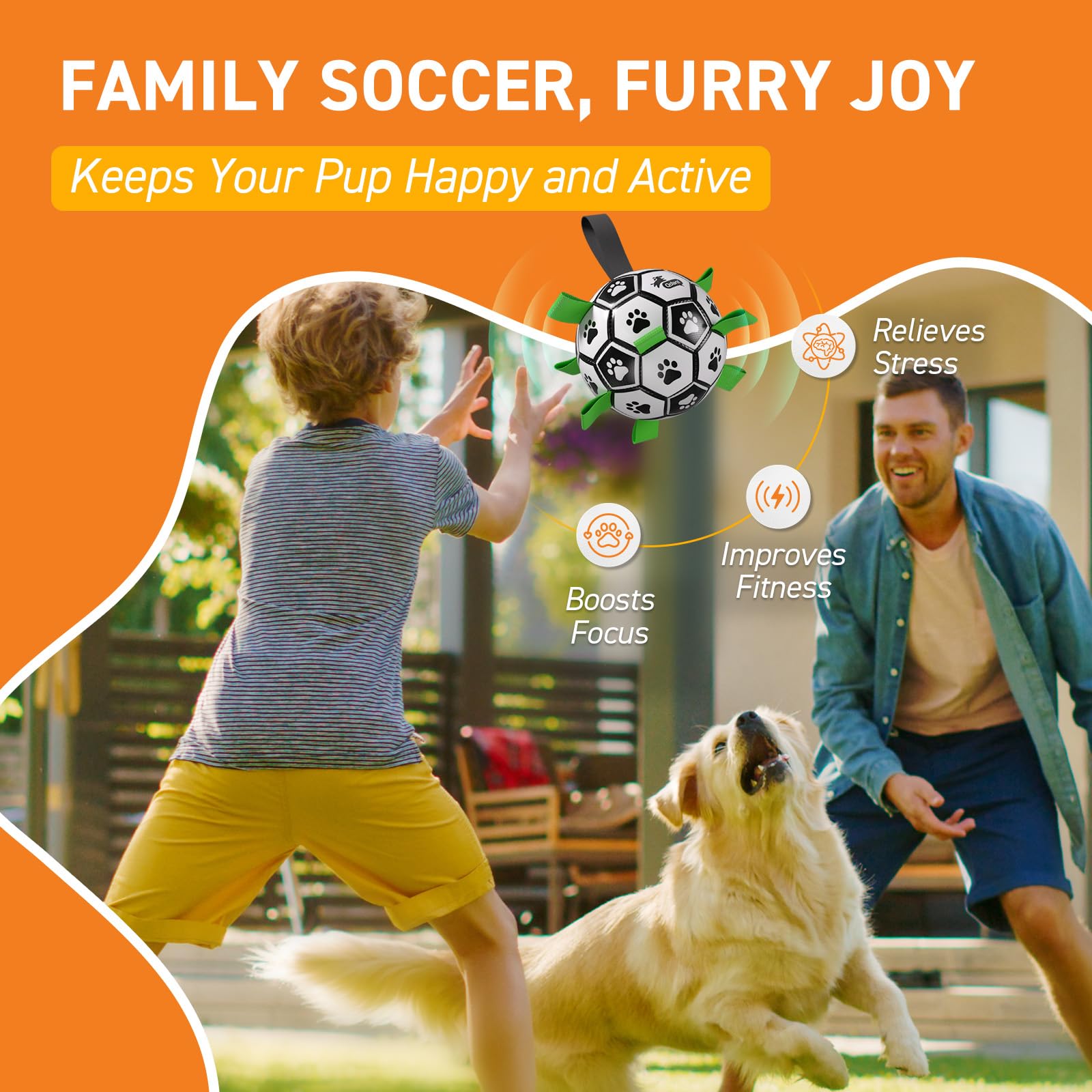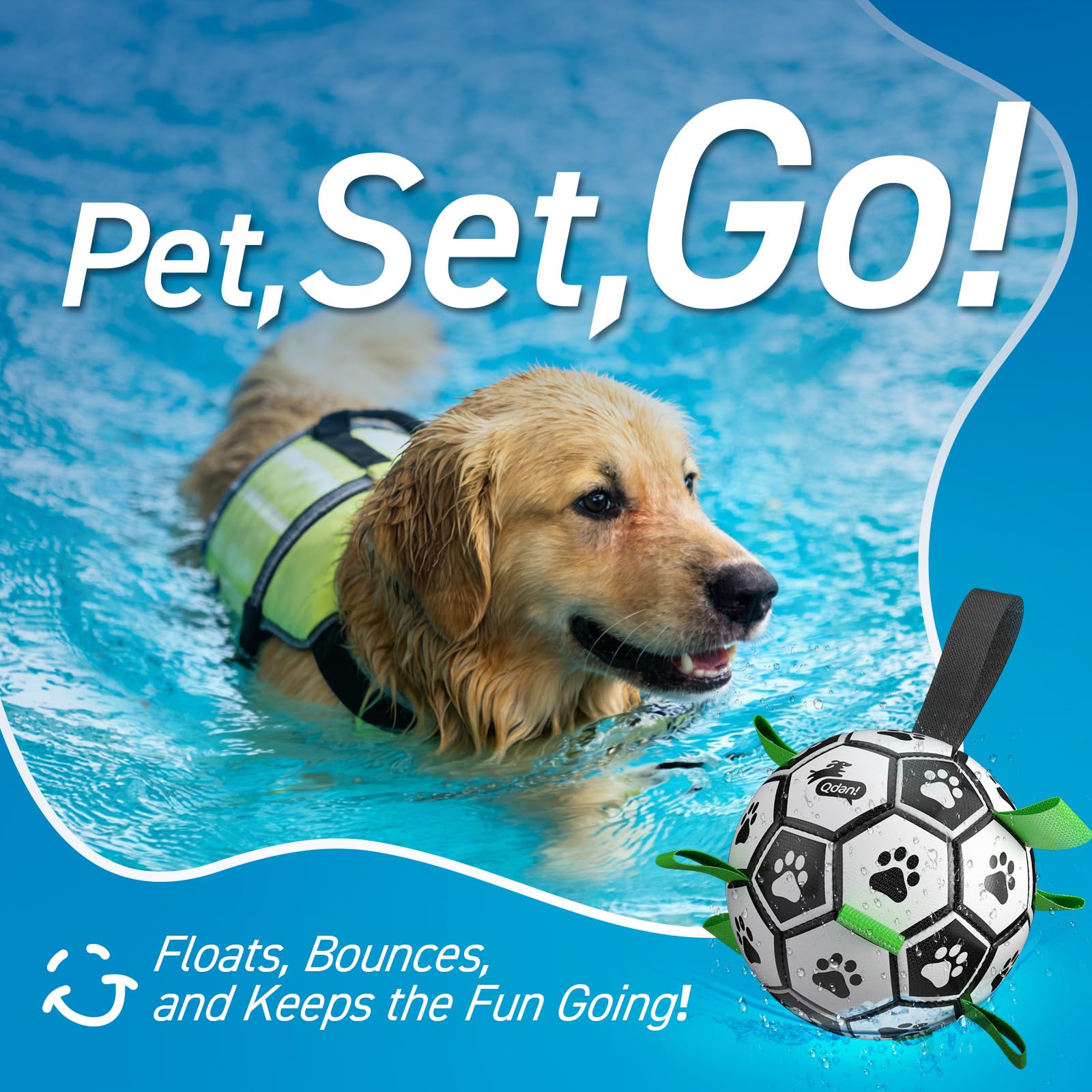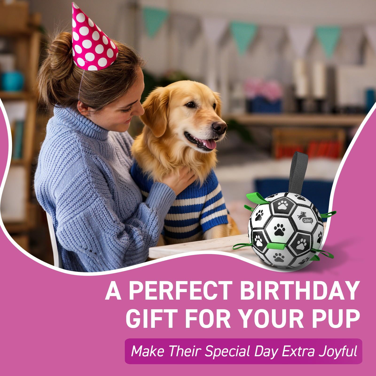 Upgrade interactive Dog Toy: Dog soccer ball with nylon tabs sewn evenly into the seams not only create an erraticbounce that dogs love to chase, but also make lt easler for the dogs to fetch, toss, tug and retrleve. Dog paws areprinted evenly on the dog loys ball to atlract dog's altention. There's a longer strap for people to hold onto the ball