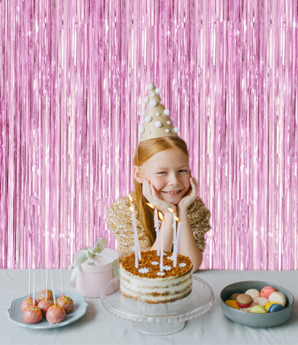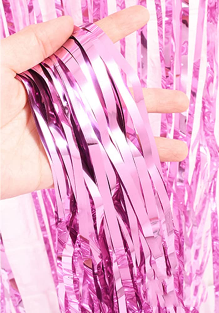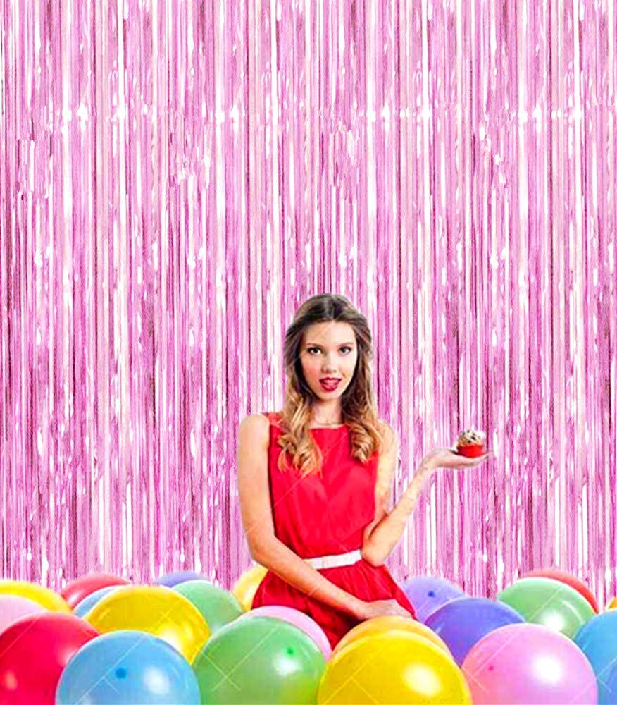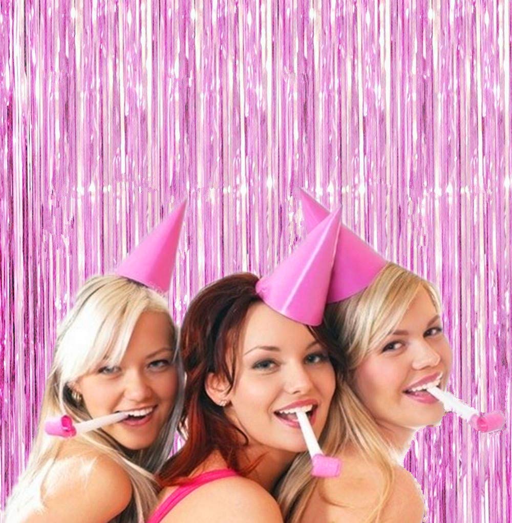 i-CHONY - Pink backdrop curtains,photo booth props,pink party decorations,streamers Size: 3.2 feet wide * 8.2 feet long Package Includes: 2 pack pink foil fringe curtain Shiny pink backdrop decorations applicable to any party occasion,use your creativity to leave fabulous party photos for you. Paste or hang fringe curtains on a smooth surface,which can be stored for a long time and hang on the wall more safely.There is double sided tape already fixed to the back of them. Just peel plastic strip off and hang it up.