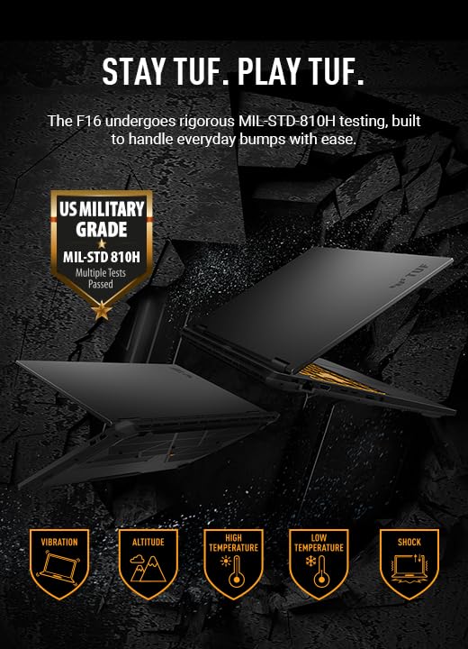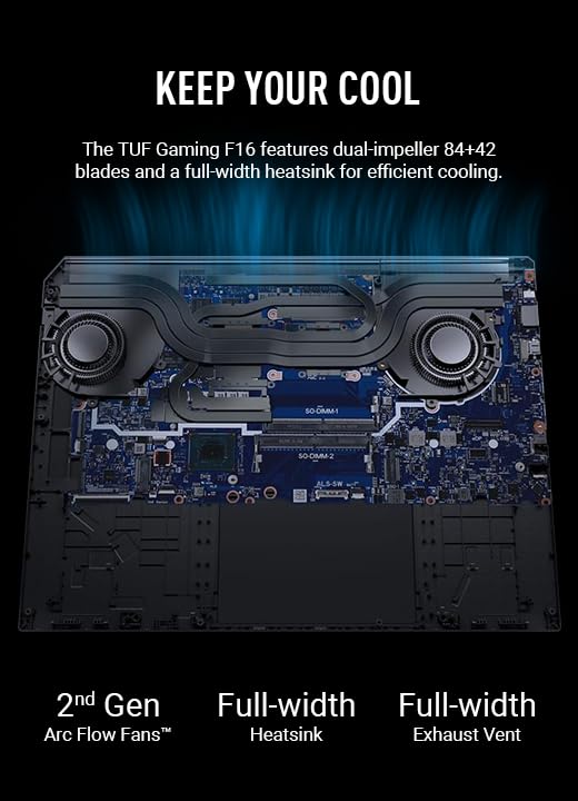 Advanced Cooling System: The ASUS TUF F16 gaming laptop is engineered with a comprehensive cooling suite to maintain optimal performance even during intense gaming sessions. It includes 2nd Gen Arc Flow Fans, a full-width heat sink, and integrated dust filters that work together to dissipate heat efficiently without generating excessive noise. Users can enjoy silent gameplay while the cooling system keeps your laptop running at its best, preventing thermal throttling for consistent performance