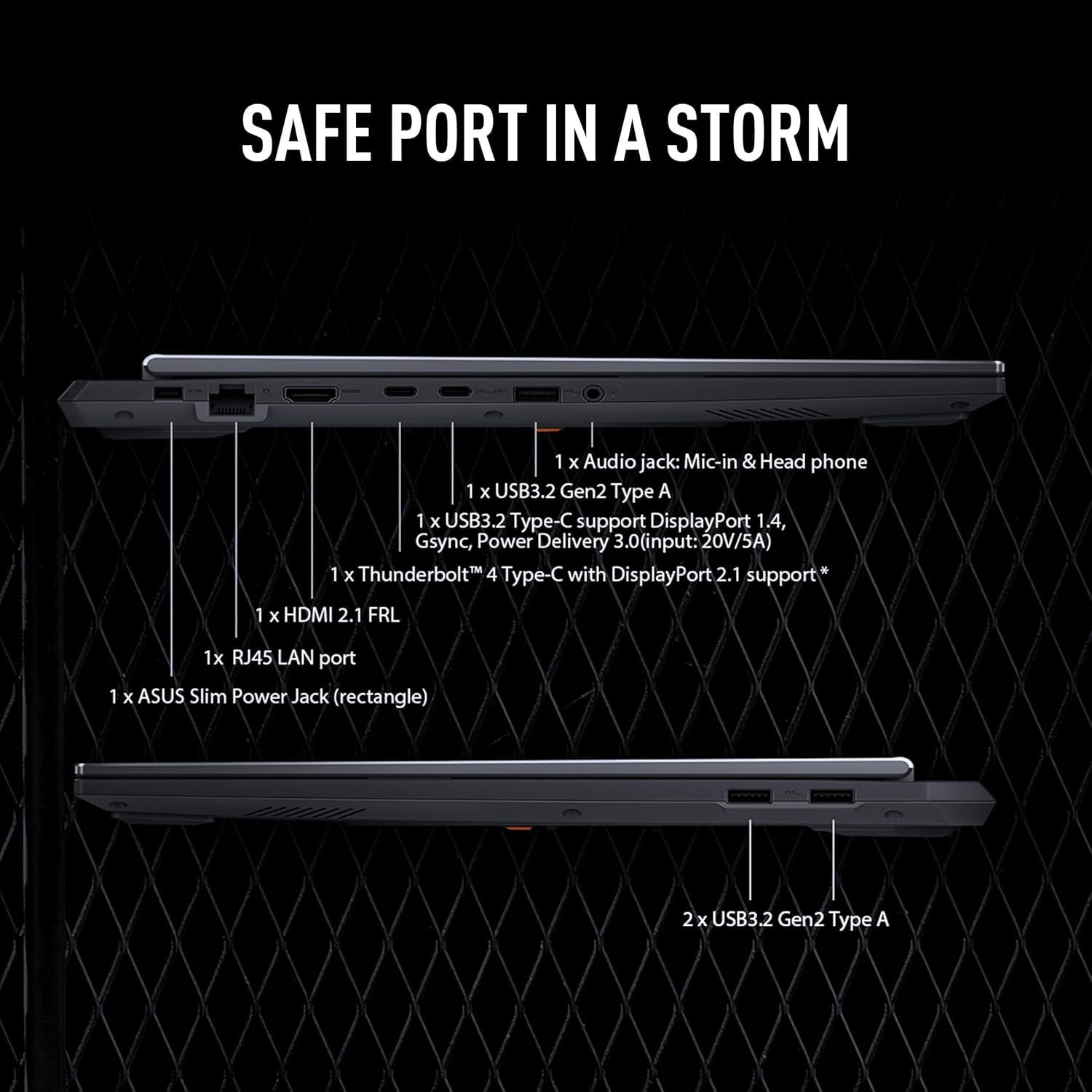 Versatile & Flexible Connectivity: Stay connected with the asus tuf f16 gaming laptop's robust connectivity options. It features an RJ45 Ethernet port for stable wired internet, three USB 3.2 Gen 2 Type-A ports for peripherals like controllers and external drives, a Thunderbolt 4 connector for high-speed data transfer and charging, a USB-C 3.2 Gen 2 port, and an HDMI 2.1 output for 4K external displays. This rich port selection keeps your gaming and productivity setup flexible and efficient