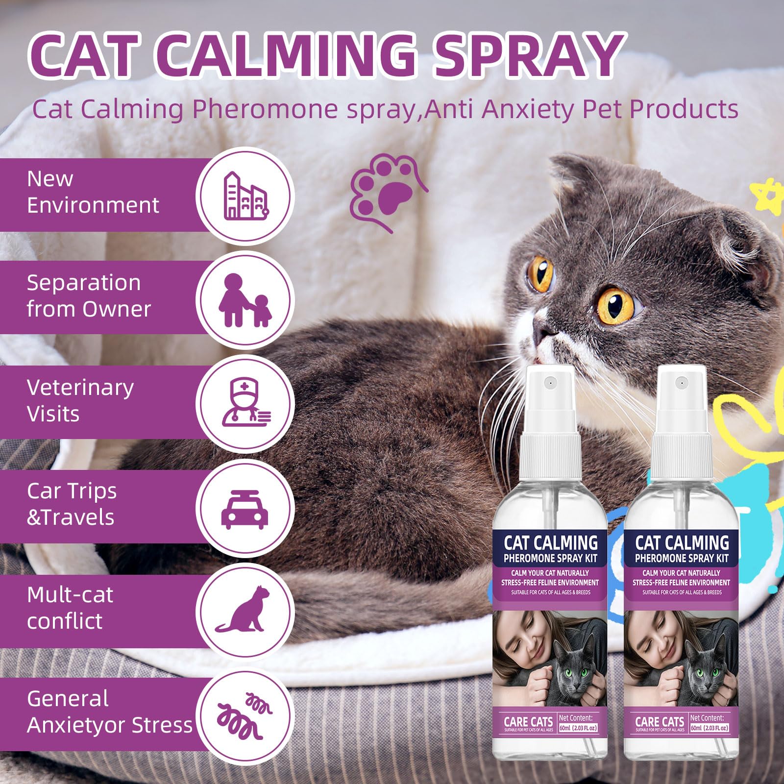 【EASY TO USE: SEE A CALMER CAT FAST】 Simply spray on your cat's bedding, carrier, or furniture (never directly on your cat) 15 minutes before stressful events. Reapply every 4-6 hours to maintain effectiveness. Many owners report observing significant positive changes, such as reduced hiding or anxiety, typically within 7-14 days.