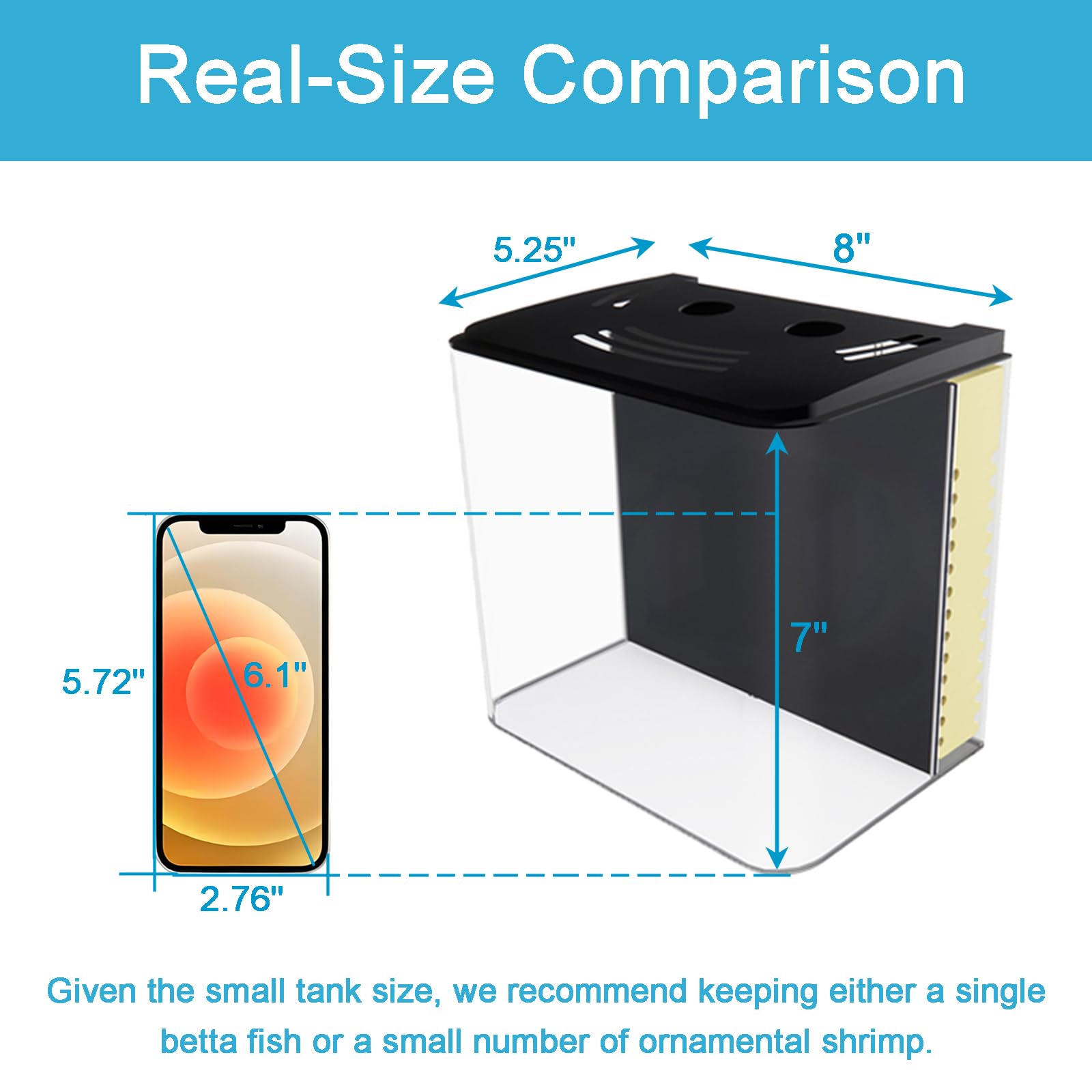 Easy to Maintain: The water filtration system reduces the frequency of water changes, which makes it a good choice for aquarium beginners or starters to keep a single Betta, a couple of shrimp, snails, or a small goldfish. Dimension:8”x5.25”x7”(LxWxH)