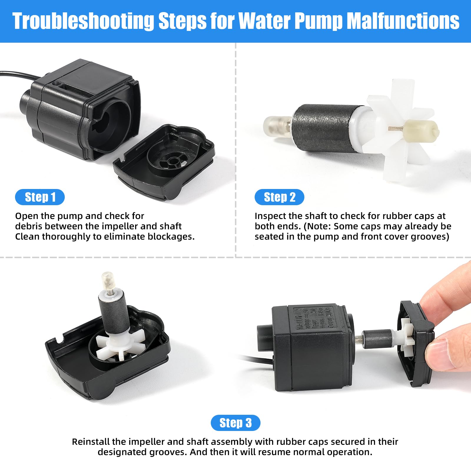 Note: No USB power adapter included, the tank needs a power adapter rated ≥ 5V/ 2A. Make sure the adapter you use is powerful enough. Insufficient power of the adapter may cause the light or the pump not working. If the pump stops working or the water flow decreases, it is time to remove the pump, clean it thoroughly, and then properly reinstall the impeller and shaft assembly to restore normal operation. And the pump need to be FULLY SUBMERGED UNDER WATER to work.