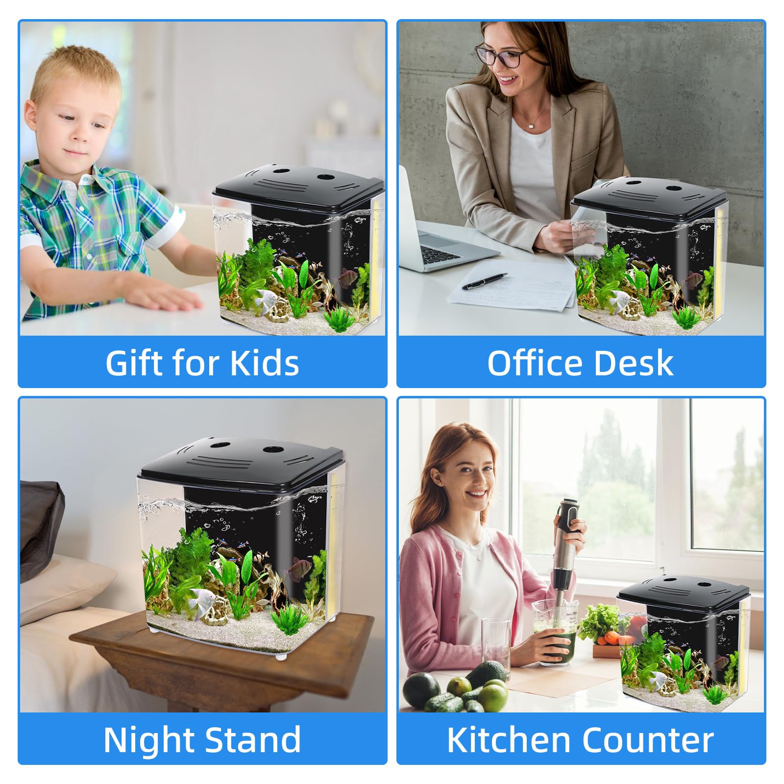 Compact Size: The tank is lightweight, cute and small and it doesn't take up too much space on the desktop or a kitchen counter. (Note: If the current is a bit strong, you can put a pre-filter sponge filter on the intake to reduce the water flow.)