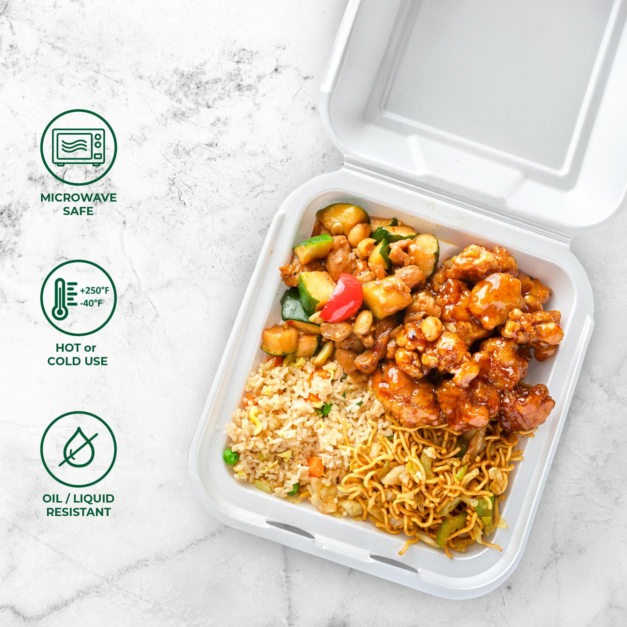 Eco-Friendly Choice / 100% Compostable - Our 8 x 8" 100 pack clamshell containers complies with BPI-certified standards for compostability. They are unbleached and PFAS Free. Ensure environmental friendliness by using PFAS Free 100% compostable food containers made from renewable and sustainable plant resources - At a commercial compost facility, they'll return to nature in 90 days.