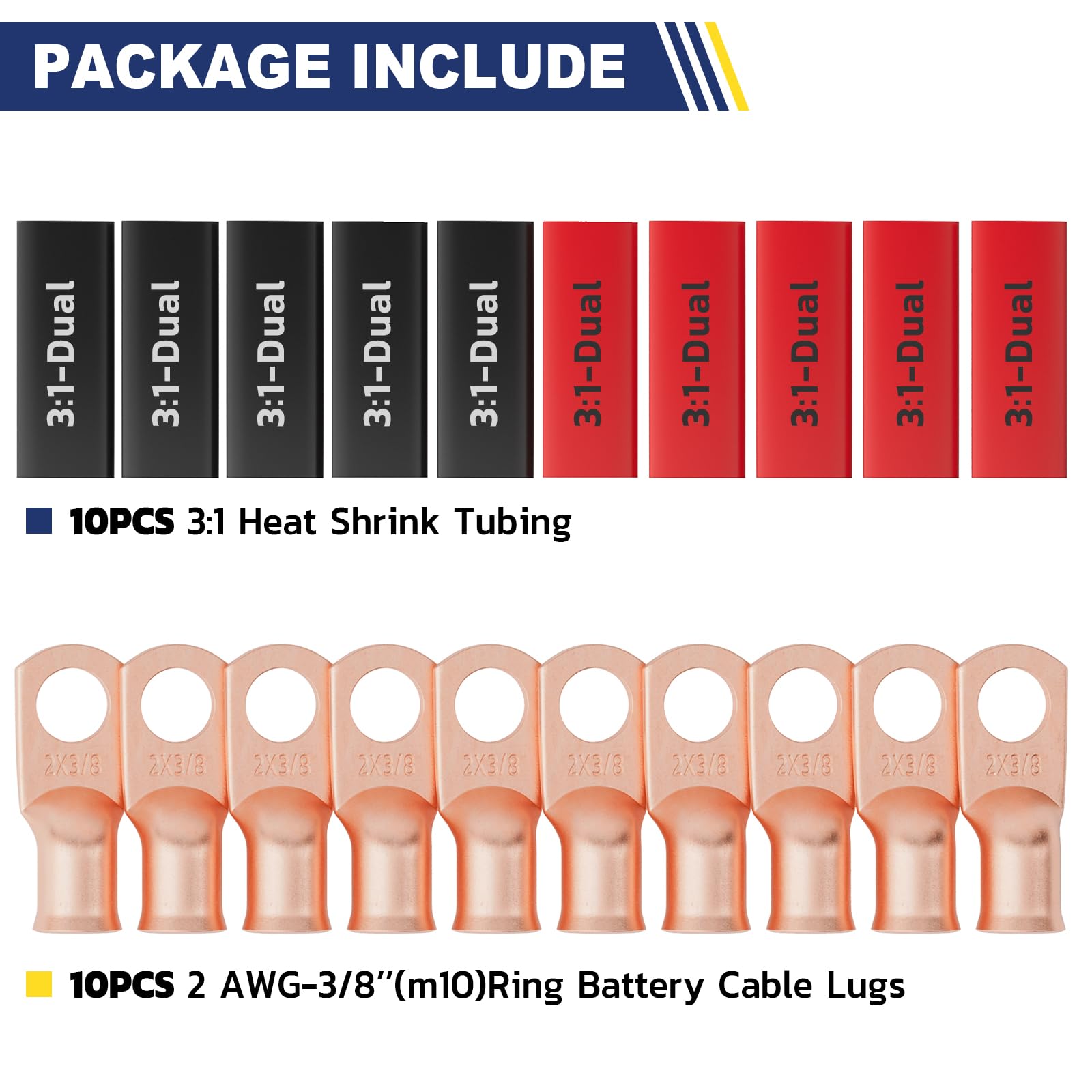 Copper Lugs and Heat Shrink Tubing Kit: 10 PCS 2 gauge (AWG) - 3/8" (M6)ring terminals copper wire lugs and 10 PCS 3:1 Dual Wall Adhesive Heat Shrink Tubing(5 black and 5 red), and comes with a sturdy clear plastic jar that make battery cable ends easy storage
