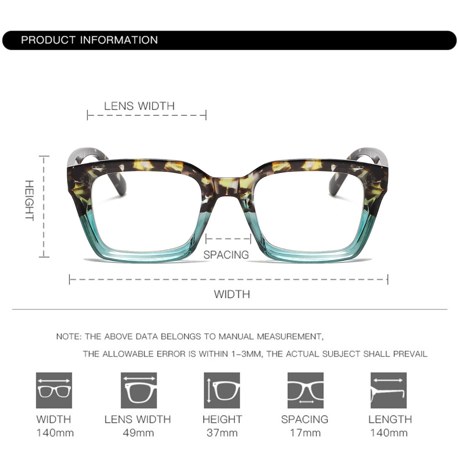 PRODUCT DIMENSION: Lens Width: 50mm(1.97inches), Lens Height: 36mm(1.42inches), Temple Length: 142mm(5.59inches), Nose Bridge: 17mm(0.67inches).