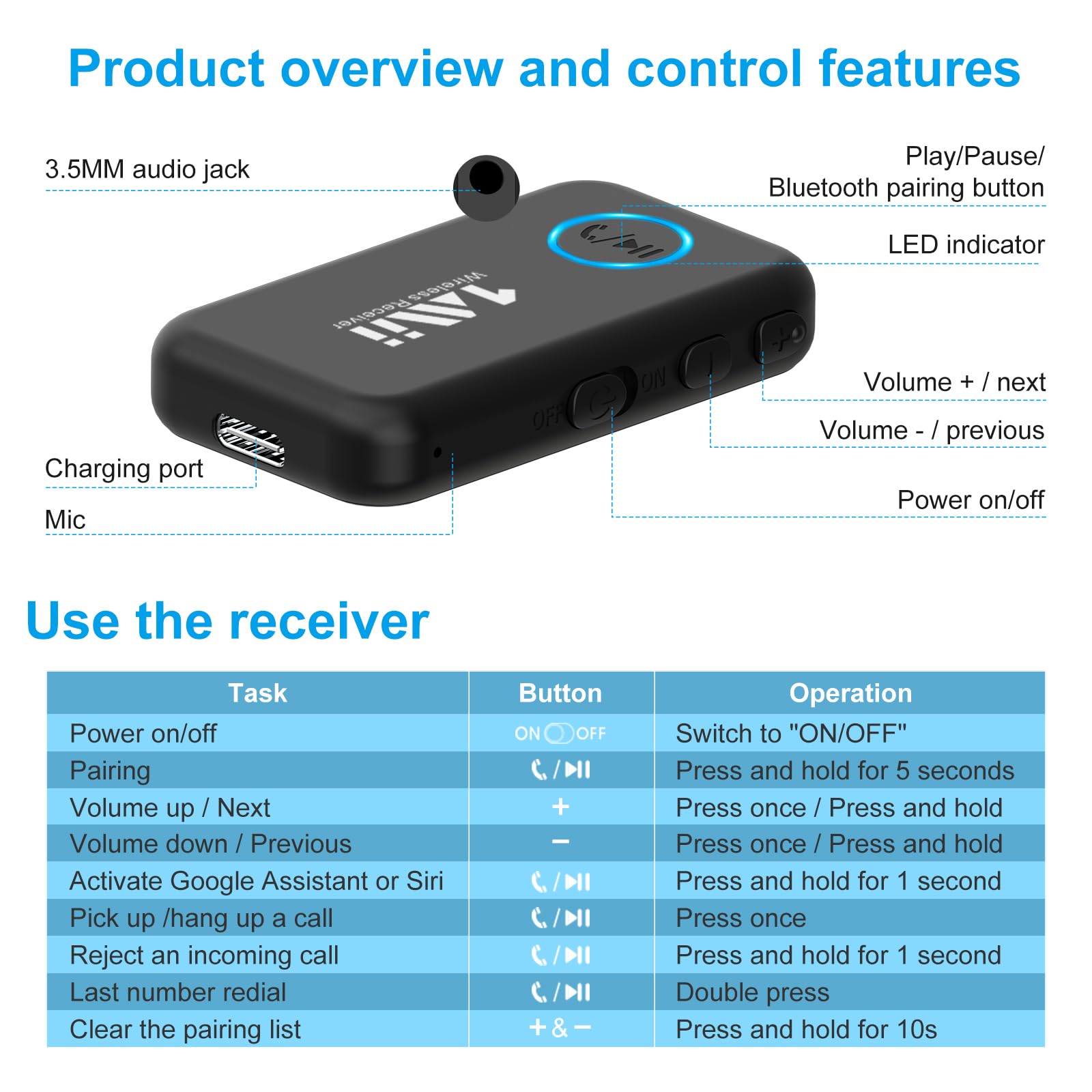 【Instant Setup, Plug and Play】 1Mii Bluetooth car adapter aux features an ON/OFF slider switch. When turned on for the first time, it automatically enters pairing mode. Plug, pair and play. It just works!