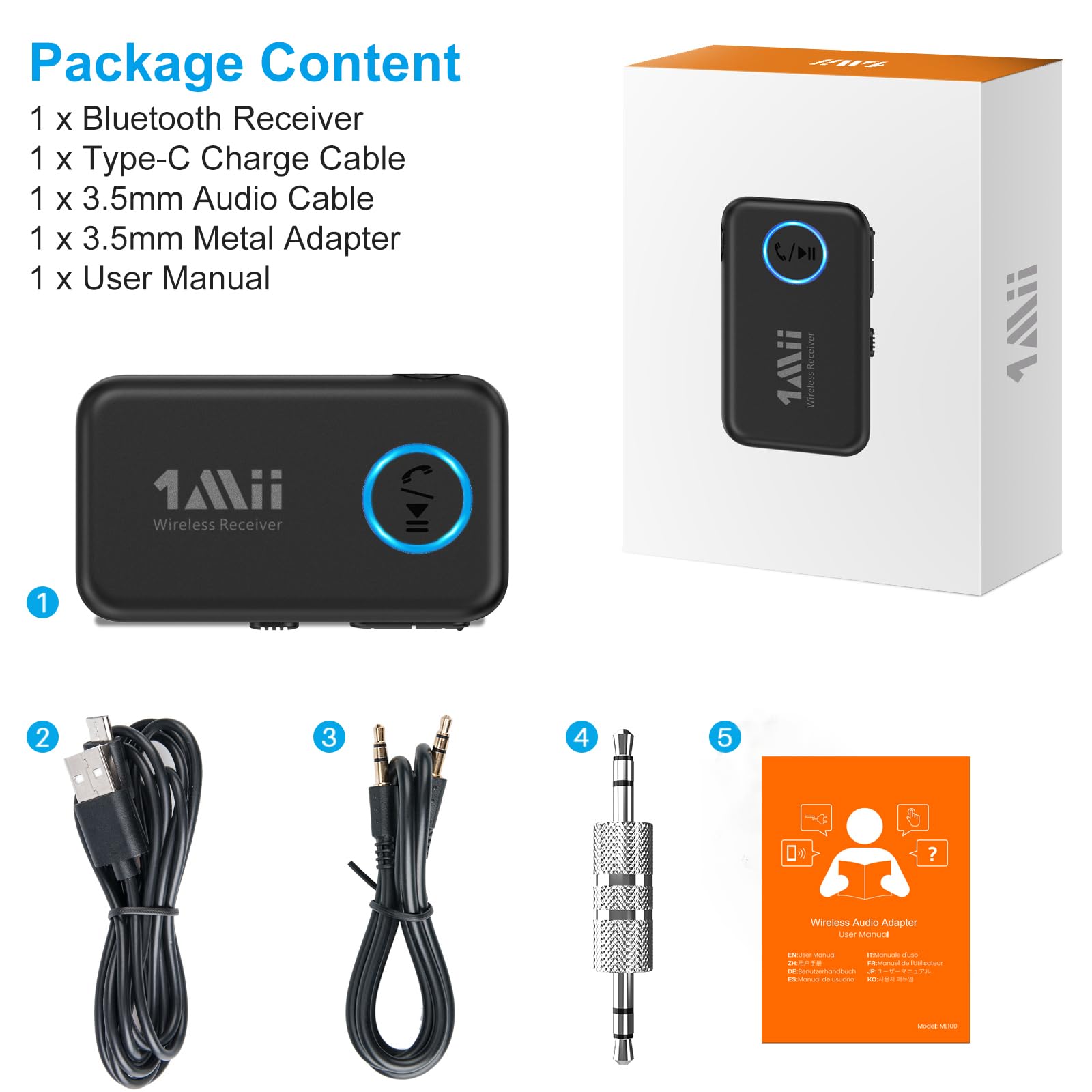 【Long Battery Life】1Mii AUX Bluetooth adapter has long battery life and can support 16 hours of continuous use to play music or calls. In addition, the small and portable size of the bluetooth aux adapter is very convenient to use in the car or carry it with you.