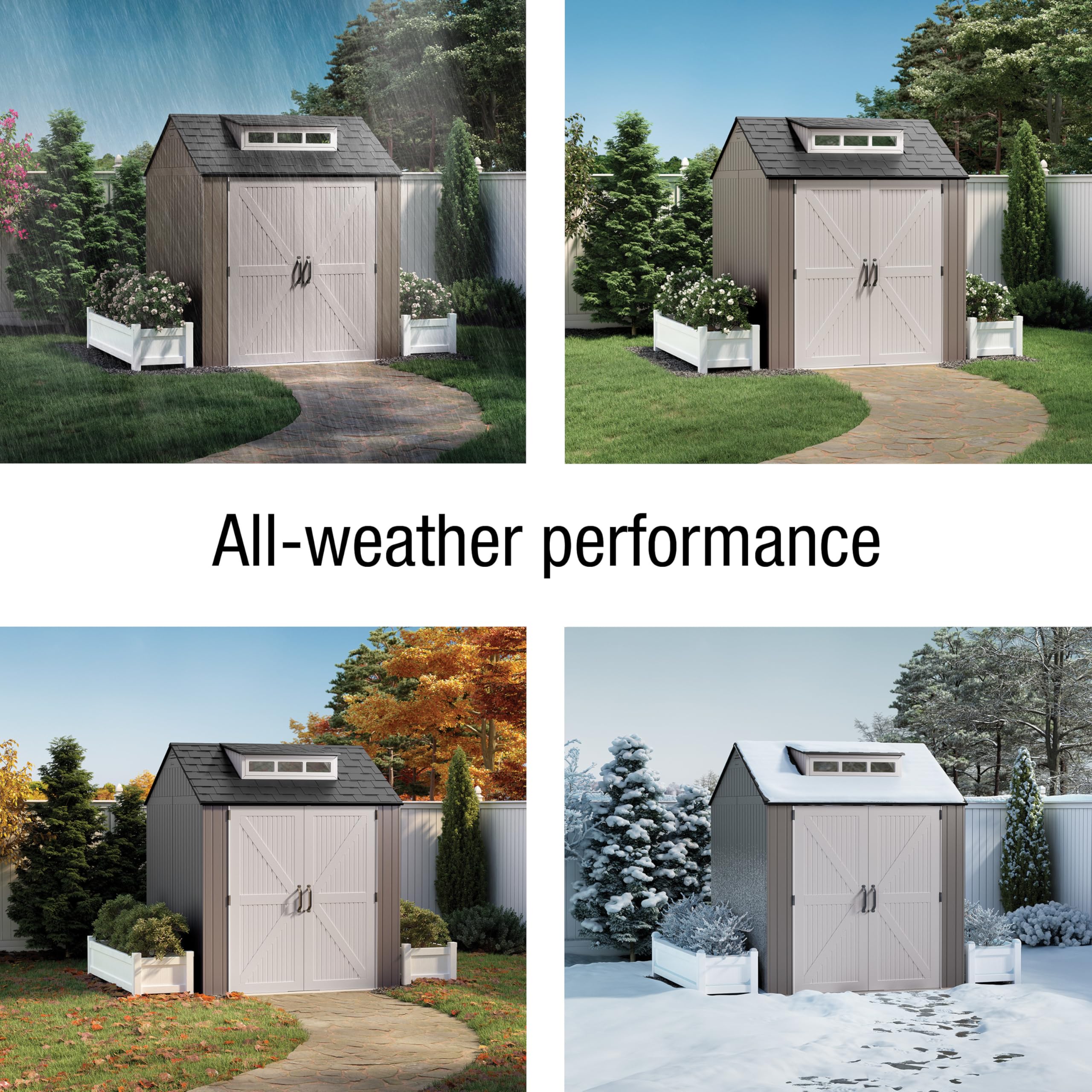 The 7-ft. x 7-ft. Shed is made of durable resin that won't rust or rot, providing weather resistance all year long. This storage shed stores large lawn care essentials,sporting equipment, garden tools, bicycles and more.