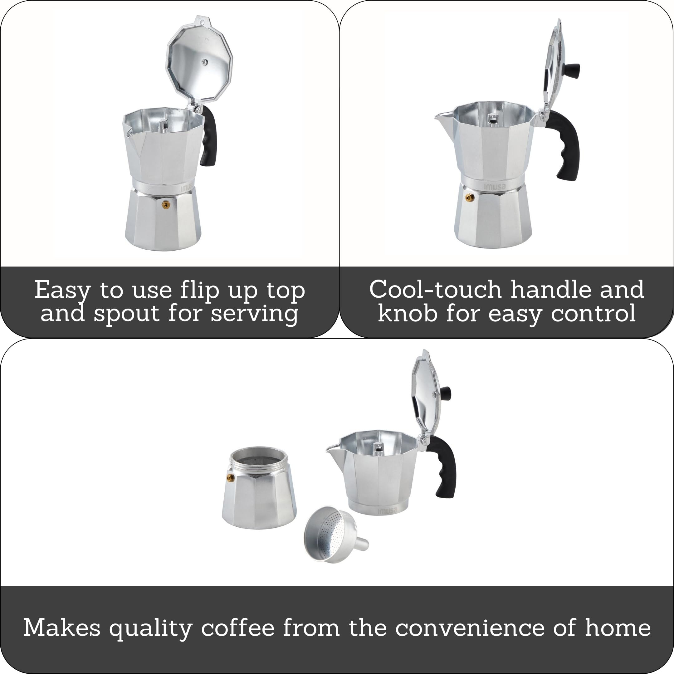 Product Description This IMUSA Aluminum Coffeemaker has the classic style your looking for in a stove top espresso maker, with the quality of a IMUSA brand product. IMUSA has been producing coffeemakers for over fifty years and is considered one of the top manufacturer of coffeemakers in the world. This coffeemaker makes 6 cups. It brews a traditional Espresso Coffee in minutes. Made for the stove top, it can be used on all gas, ceramic or coil surfaces. The bakelite handle provides for easy handling. Made from durable long lasting aluminum. Recommended hand wash only. From the Manufacturer IMUSA stovetop espresso makers allow you to be a barista at home! This stovetop espresso maker brews under a mild pressure, forcing hot water up from the base through ground coffee then into the top carafe in just minutes! You will love the rich, full-bodied flavor produced by this stovetop method, made popular in Europe and Latin America.