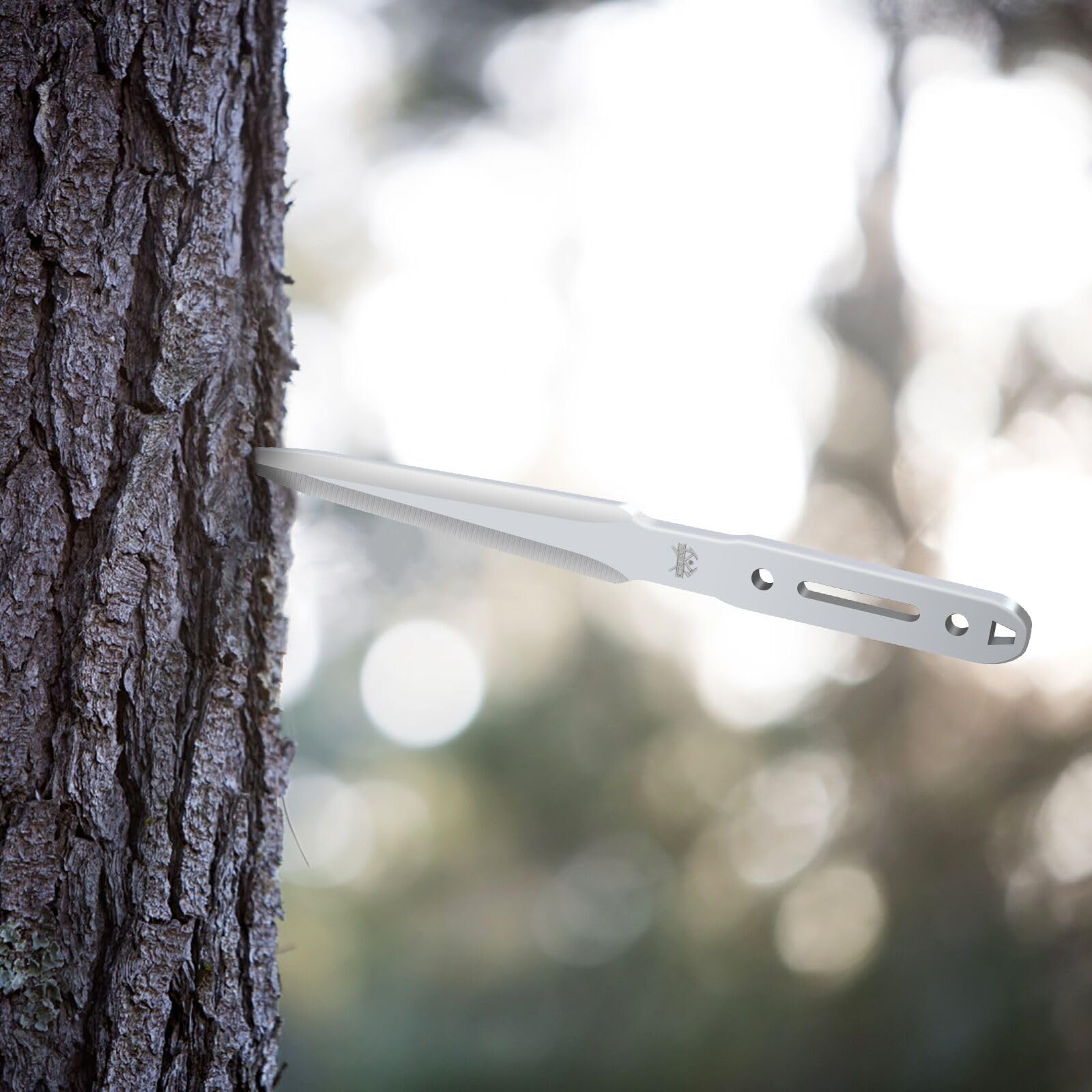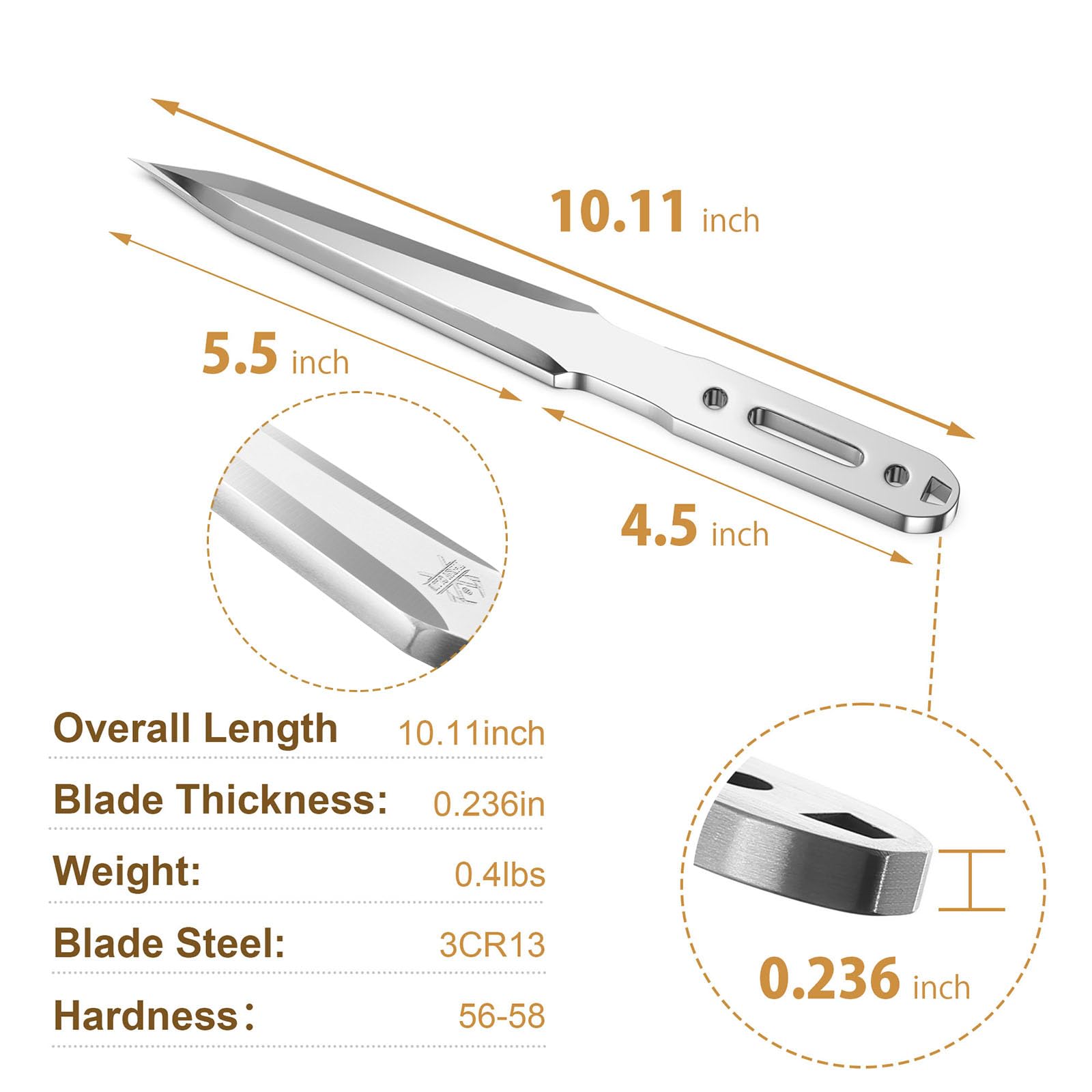 THRWCLUB Frigid Sword Specifications: Blade material: 3CR13 Stainless Steel Hardness: 56-58 Overall length: 10.11 inch Thickness: 0.236 inch Individual weight: 0.4 lbs Sheath: Nylon sheath Package includes: Throwing knives X 3 Nylon sheath X 1