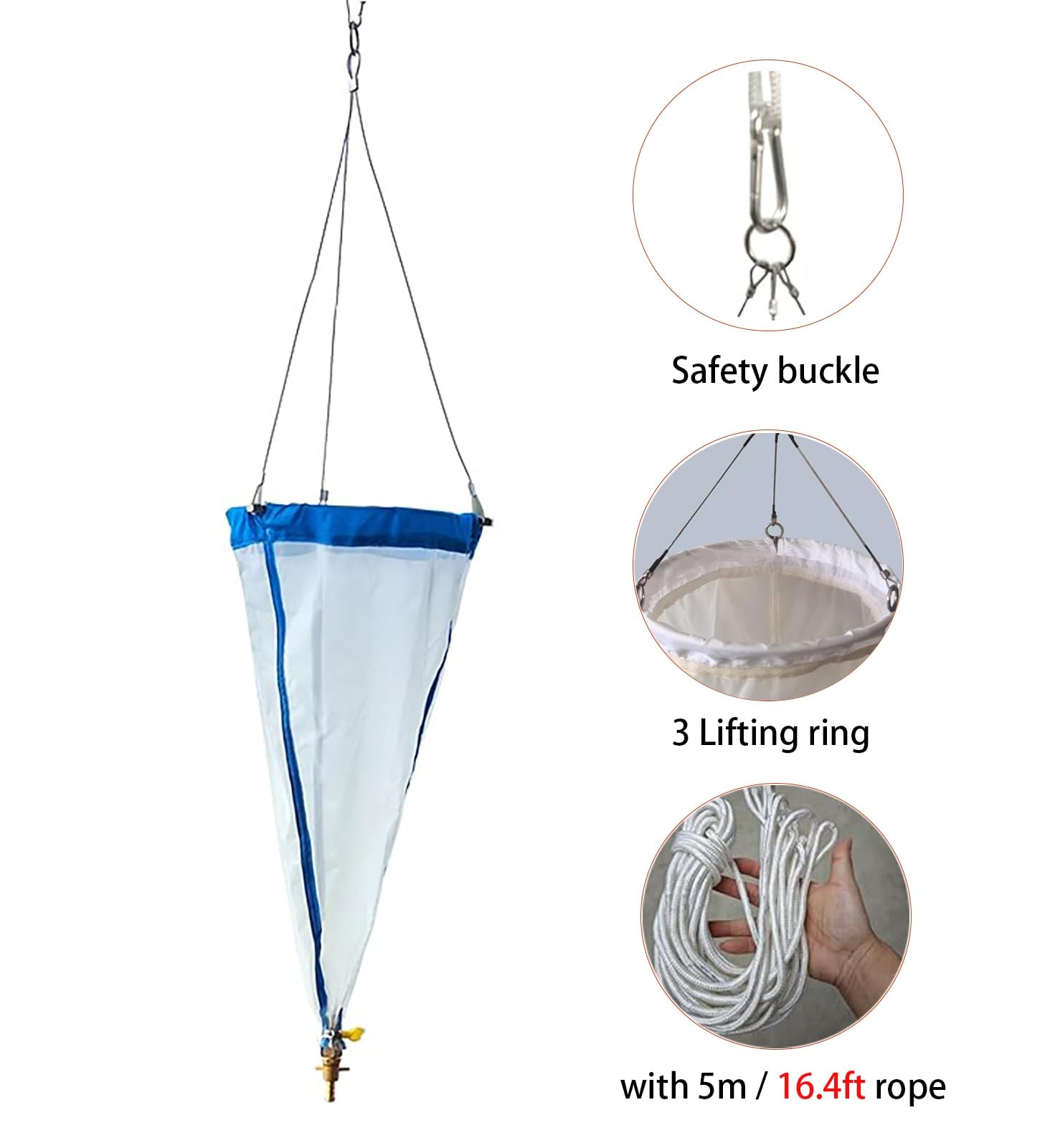 【 Package List 】: 1 x plankton collection net, 1 x 5 m / 16.4ft sampling rope, 3 x lifting ring, 1 x safety buckle