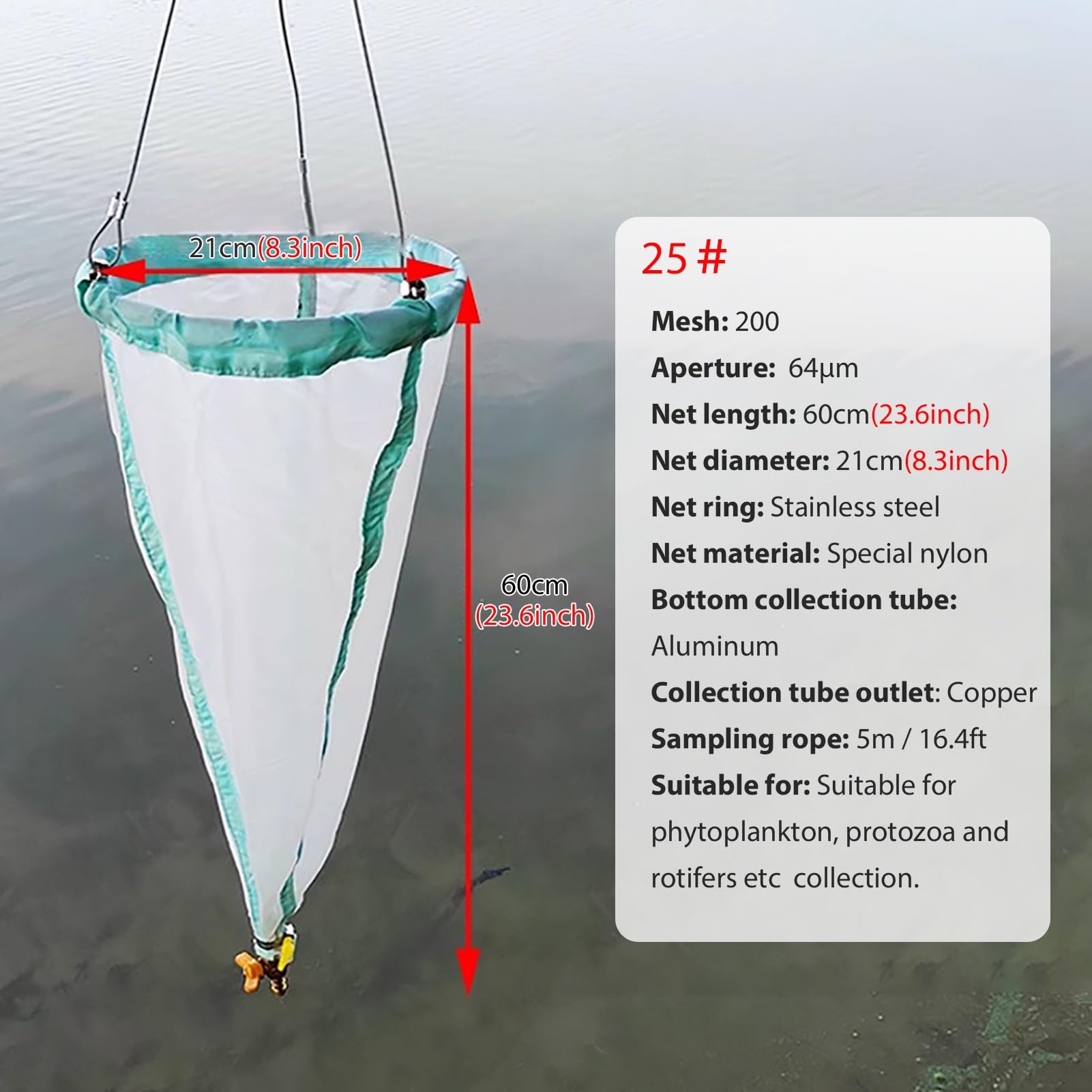 【 Product Description 】: Aperture: 64μm, Net length: 23.6in, Net diameter: 8.3in, Net material: special nylon, Net ring material: 304 stainless steel, Bottom collection tube: aluminum, Collection tube outlet: copper